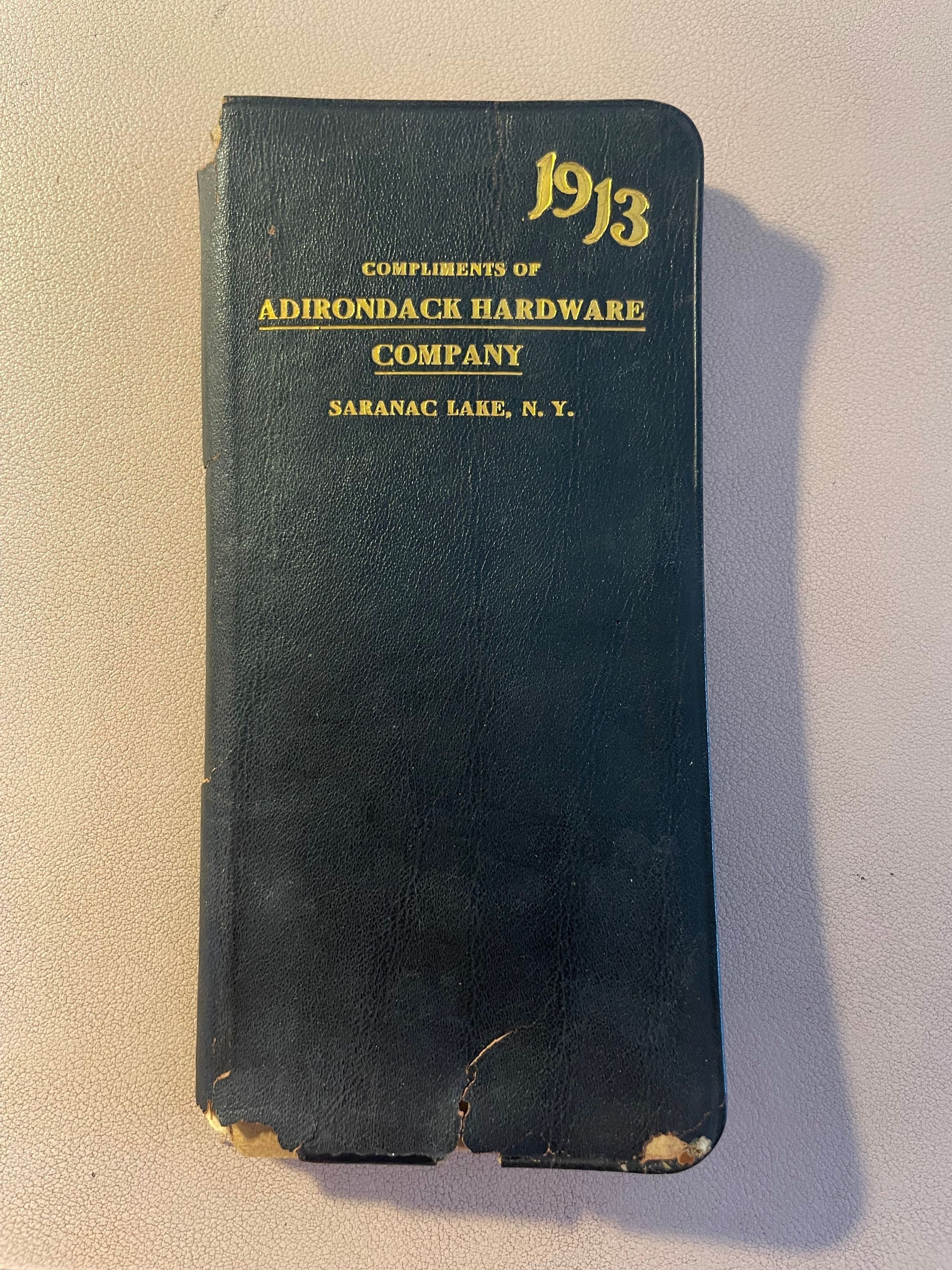 Appointment or day book for the year 1913, issued "compliments of Adirondack Hardware Company, Saranac Lake, N. Y." Includes advertisements for products and services offered by the Adirondack Hardware Company ("AD-HAR-CO"). Includes an address, cash, and almanac-type sections. Owned by Mrs. Elsie Stiles, Brooklyn, NY. Largely unused.Lexicon