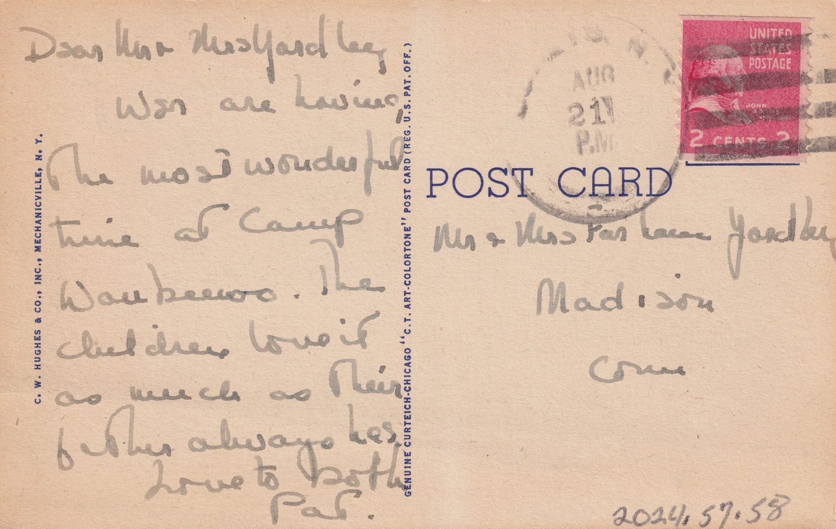 Color postcard showing mountains behind a body of water. Printed caption on front reads, "Mt. Ampersand Across Middle Saranac Lake, N.Y. Adirondack Mts." Printed by C. W. Hughes & Co., Mechanicville, NY. Used, linen, divided back, white border, postmark illegible. Handwritten message on reverse reads, "Dear Mr. & Mrs. Yardley, We are having the most wonderful time at Camp Waubenoo. The children love it as much as their father always has. Love to both, Pat." Mailed to Mr. & Mrs. Farnham Yardley, Madison, Conn.Subject Place
