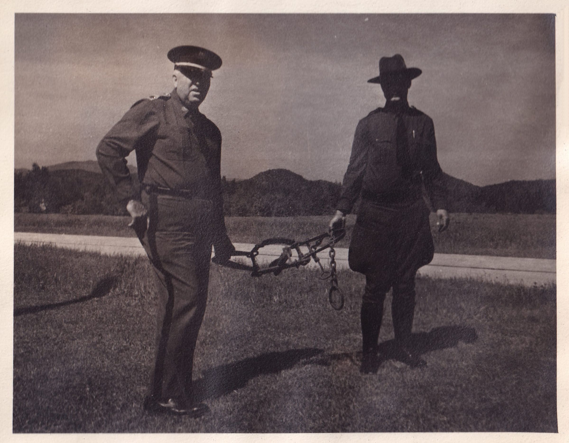 Black-and-White photograph of two men in game warden uniforms, holding a metal animal trap between them.