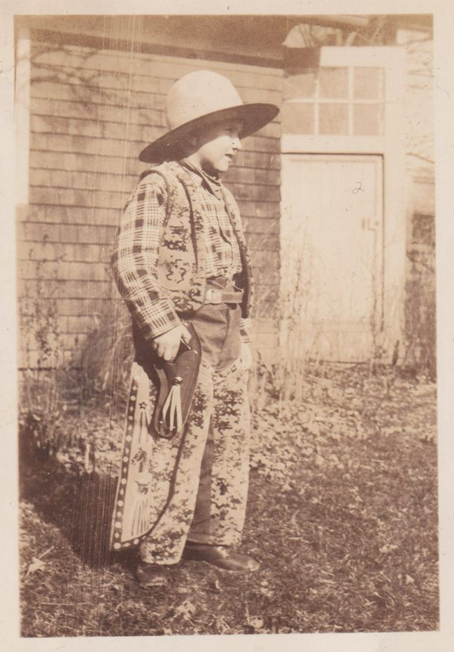 Black-and-White photograph of a young Edward Weishal, Blair Jones' nephew. He is wearing a cowboy costume. The Jones Family took a long road trip in 1934 that included stopping at the home of Blair's parents in LaGrange, IL.