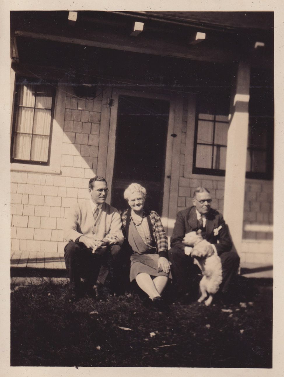 Black-and-White photograph of D. Blair, Abbie, and Edward Jones with Peggy, the family dog. They are seated on the porch of a building, possibly the Danforth Cottage at the end of Lake Street.Made/Created