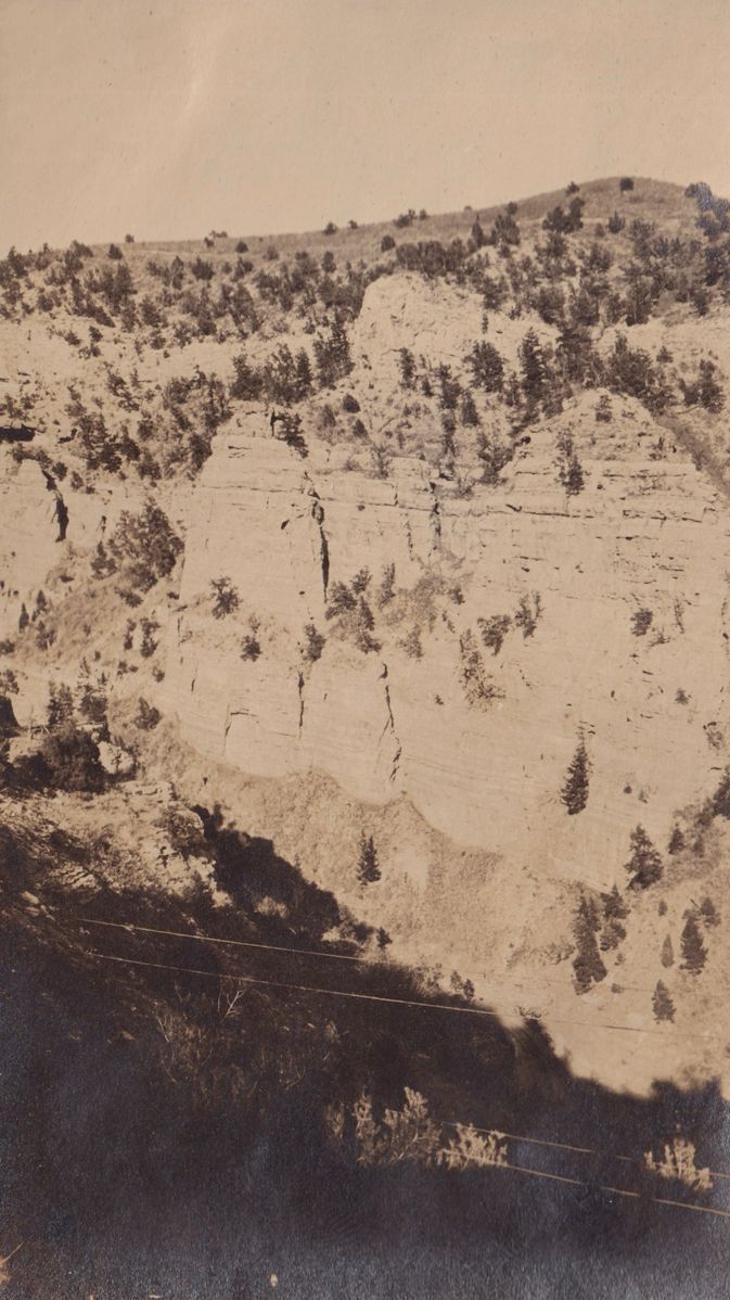 Black-and-white photograph of a rocky cliffside, taken from another cliff on the other side of a canyon. There are some trees growing on the cliff sides.