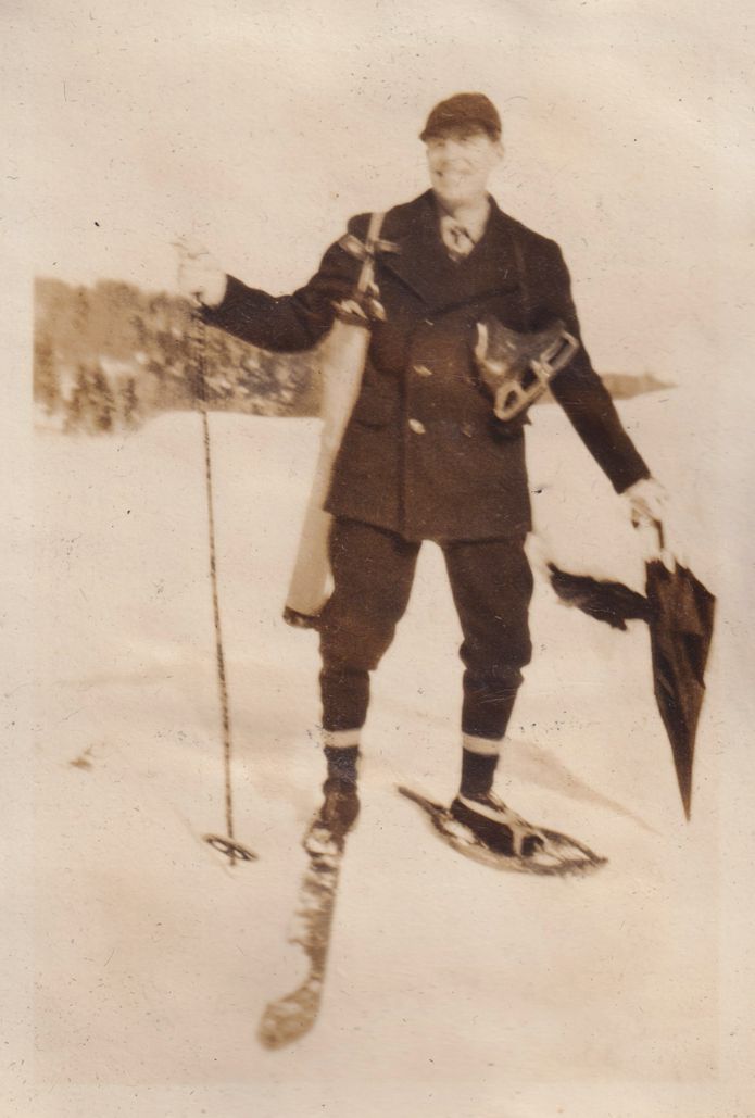 Black-and-White photograph of D. Blair Jones in the snow. He is wearing one ski and one snowshoe, and carrying a bag of golf clubs, a pair of skates, an umbrella, and a ski pole.Photograph Details