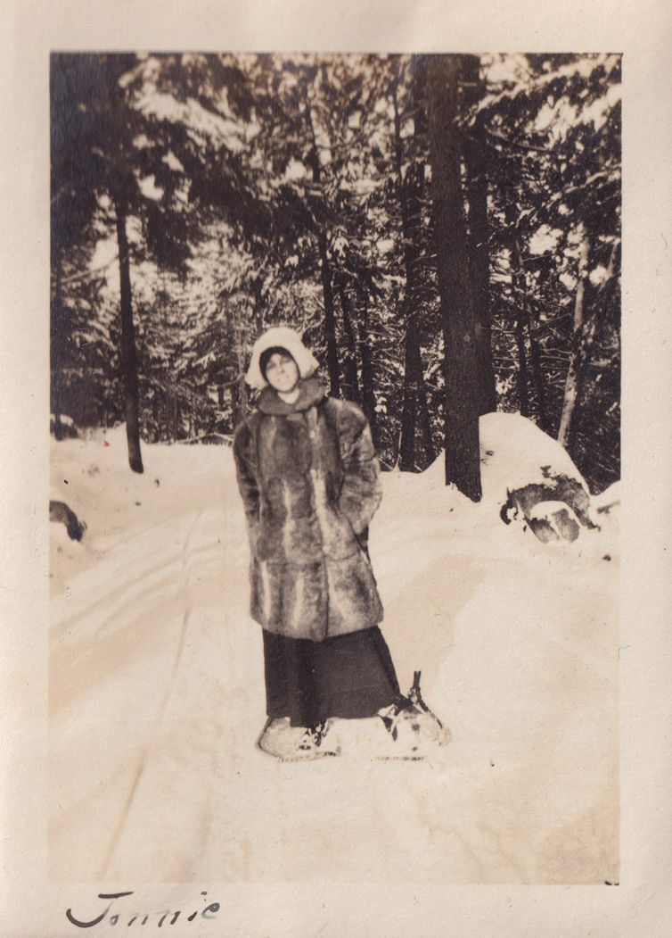 Black-and-white photograph of a woman in winter gear--a fur coat, hat, and snowshoes--outside on a snow-covered path through the woods. "Jonnie" is written in ink at the bottom of the photograph.