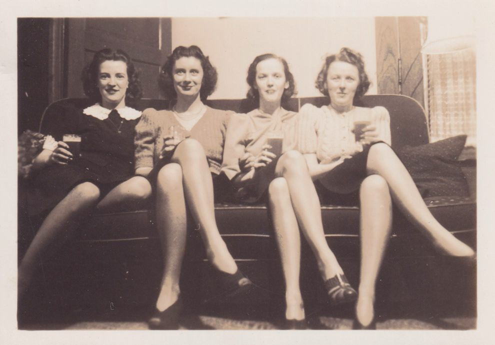 Black-and-White photograph of four women sitting on a couch. Three of them have their legs crossed at the knees, and they are all holding drinks. The photograph was likely printed by Kollecker's Kodak and Gift Shop.