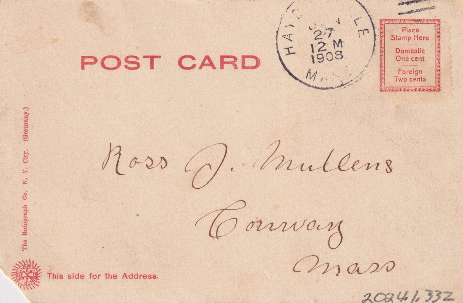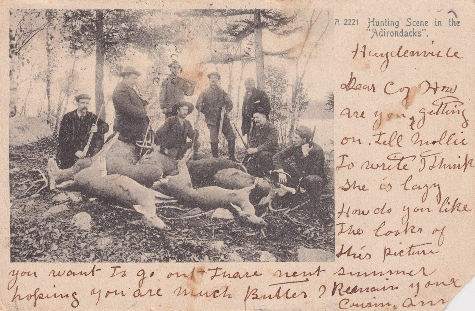 Postcard with a picture of a group of hunters with five slain deer in the woods. The postcard is addressed to Ross J. Mullens.