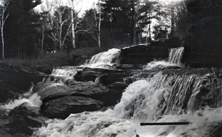 Negative of water flowing over rocks and into rapids in a forest. Most likely taken by Mary Ives Baldwin. This item is not fully cataloged but has been uploaded so the image is publicly available; if you would like us to prioritize cataloging this item, please contact the HSL Collections team.