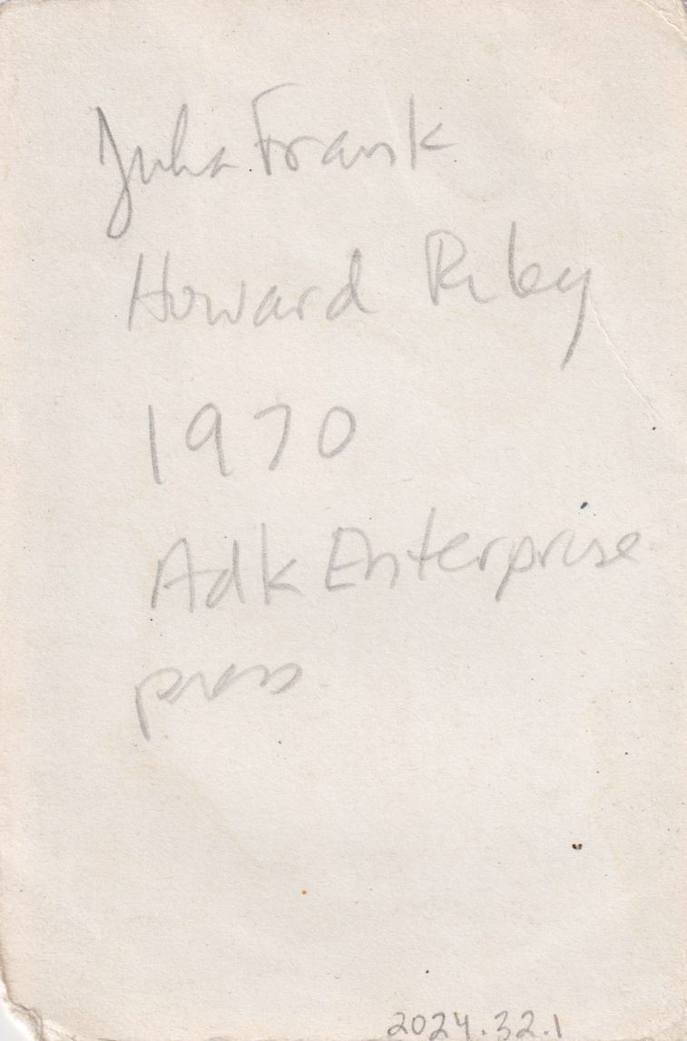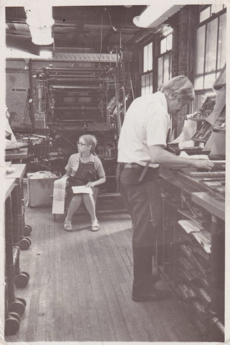 Black-and-White photograph of a young Julia Frank in the printing room at the Adirondack Daily Enterprise. She is seated on a bench in front of a large press, with an apron on and papers on her lap. Howard Riley is standing at a work table nearby. Handwritten note on reverse reads, "Julia Frank, Howard Riley, 1970, ADK Enterprise press."Photograph Details