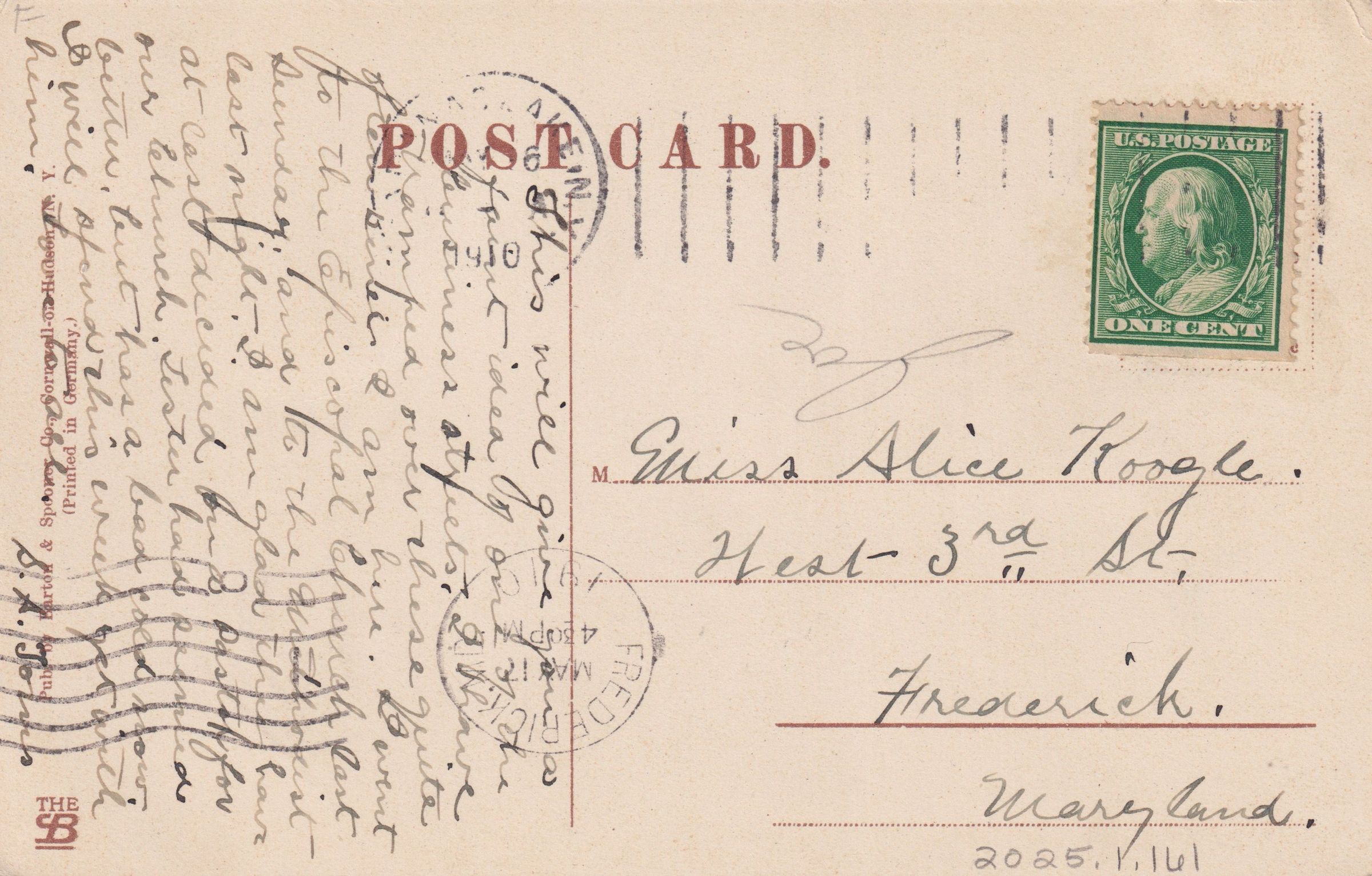 Handwritten message on reverse reads, "This will give you a faint idea of one of the business streets. I have tramped over these quite often since I am here. I went to the Episcopal Church last Sunday and to the Methodist last night. I am glad they have at last decided on a pastor for our church. Lester had seemed better, but has a bad cold now. I will spend this week yet with him. Love to all, S. A. Jones." Mailed to Miss Alice Koogle, West 3rd St. Frederick, Maryland.Subject Place