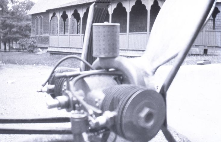 Negative of a medium-sized propeller and motor. The side of St. Luke's Church can be seen in the background. Most likely taken by Mary Ives Baldwin. This item is not fully cataloged but has been uploaded so the image is publicly available; if you would like us to prioritize cataloging this item, please contact the HSL Collections team.