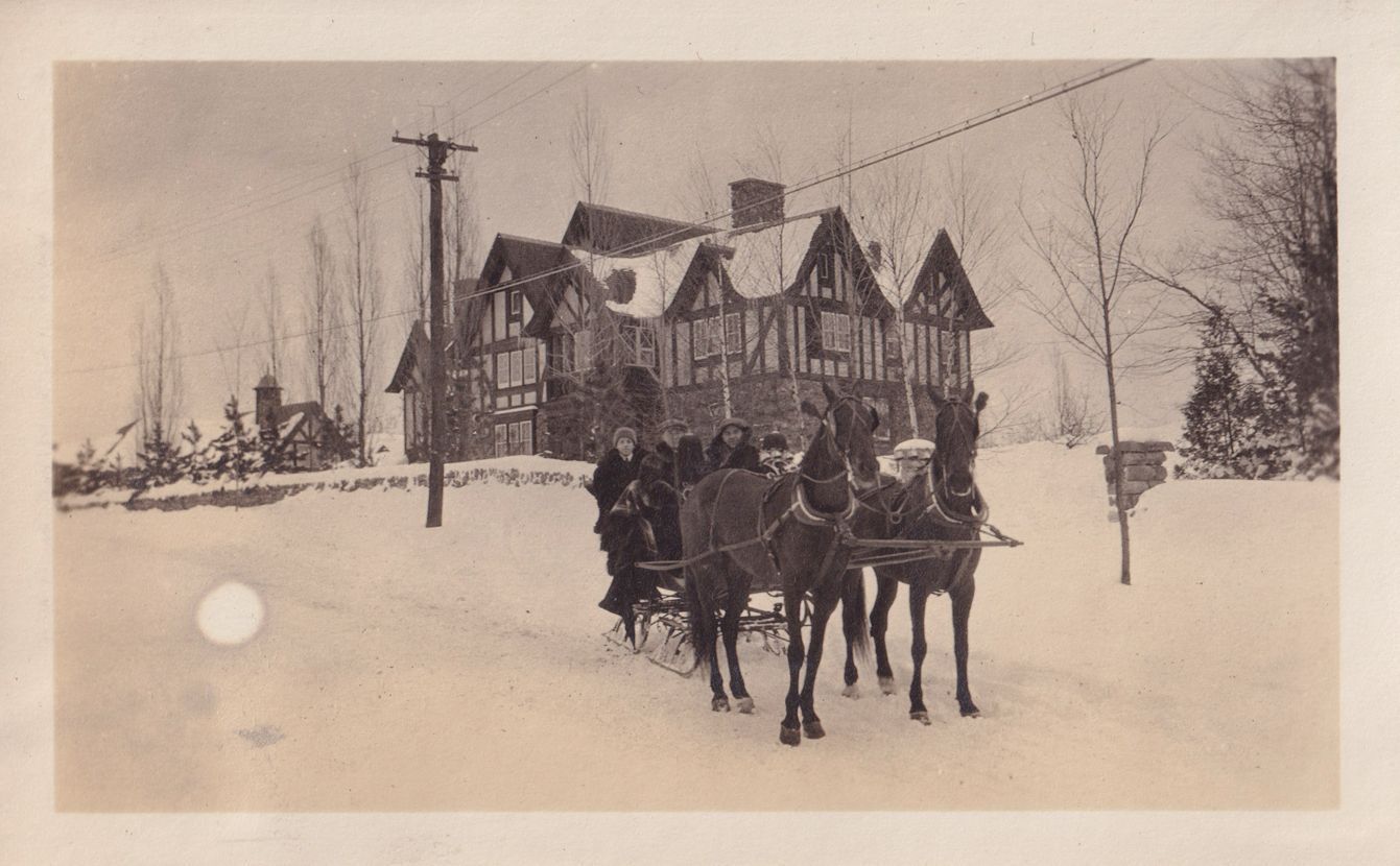 Black-and-white photograph of a group of people riding a horse-drawn sleigh along a snow covered road. There is a large building in the background, likely the Highland Manor on Park Avenue. There are also telephone poles running wires in the background.