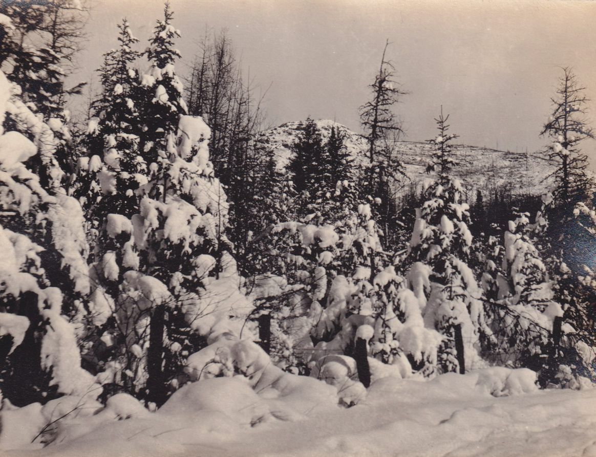 Black-and-White photograph of snowy evergreen trees. The photograph was likely printed by Kollecker's Kodak and Gift Shop. Same photograph as 2024.2.103.