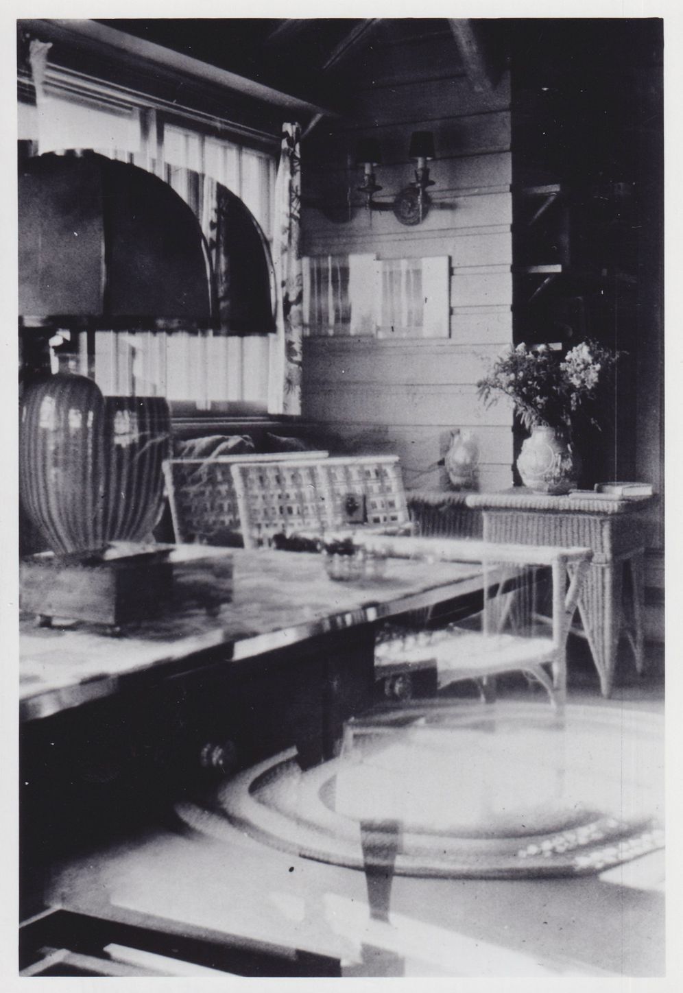 Black-and-White photograph of the interior of an unidentified cottage at Bartlett Carry Club. Print has been double exposed. Handwritten note on reverse reads, "1932-40."
