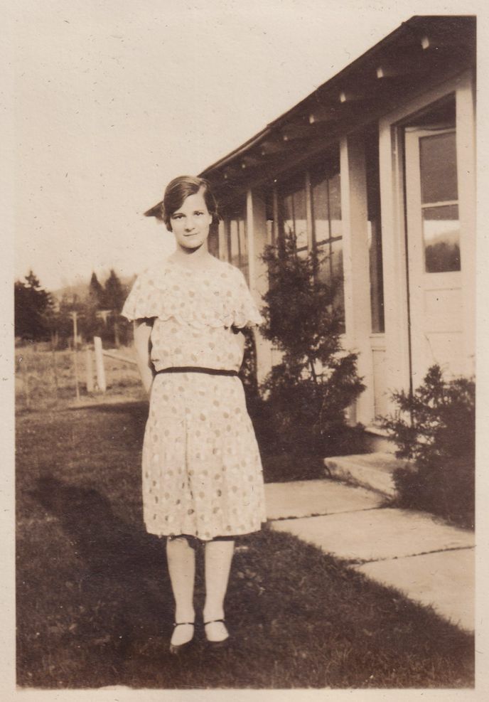 Black-and-White photograph of an unidentified young woman standing outdoors. A possible cure porch can be seen behind her. Part of album 2024.21.1, kept by Amy Jones and David Blair Jones c. 1930-1934.