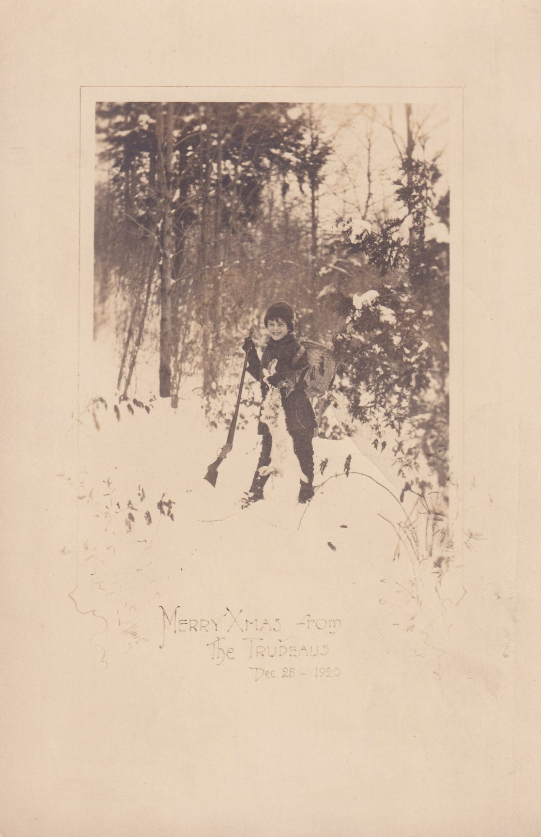 Christmas card from the family of Francis Berger Trudeau, 1920. Features a photograph of a young boy in the snow, probably Edward Livingston Trudeau (b. 1915). He is holding a rifle and a dead hare by its hind legs, and wearing a pack basket. Printed on front is, “Merry XMas from the Trudeaus, Dec. 25, 1920.”Subject Person/Organization