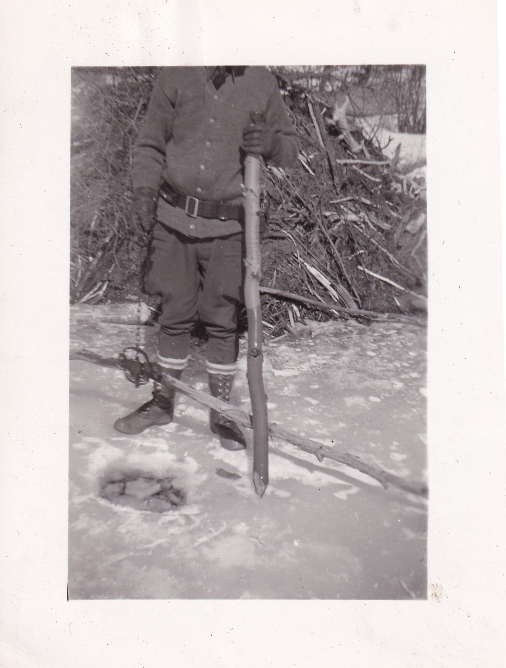 Black-and-White photograph of a person standing next to a hole in the ice. They are holding the chain of an metal animal trap and a large stick. There is a beaver dam visible behind them. Was clipped to note 2022.144.173.136 describing trap.