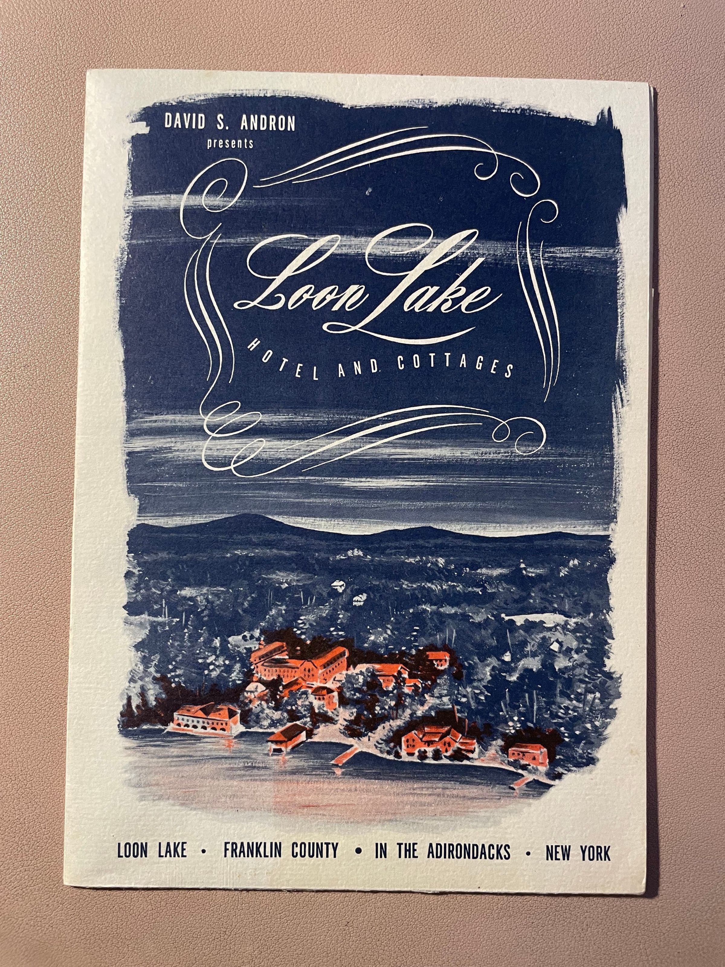 Pamphlet for the Loon Lake Hotel and Cottages, featuring illustrations and hand-colored photographs. Has information about accommodations, activities, and more, along with a map.Lexicon