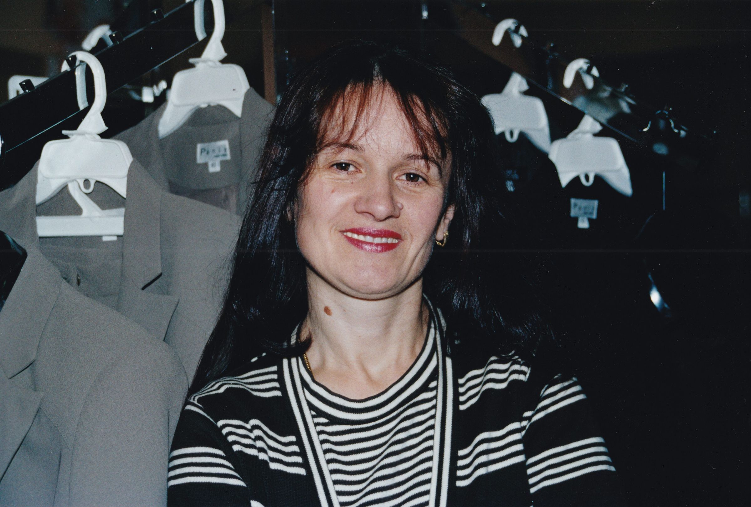 Color photograph of Selvija Cecunjanin inside of her business, Sylvia's Tailoring Shop & Boutique. Portrait taken by Mary Lou Hanpeter Banks as part of her Soul Proprietor exhibition.