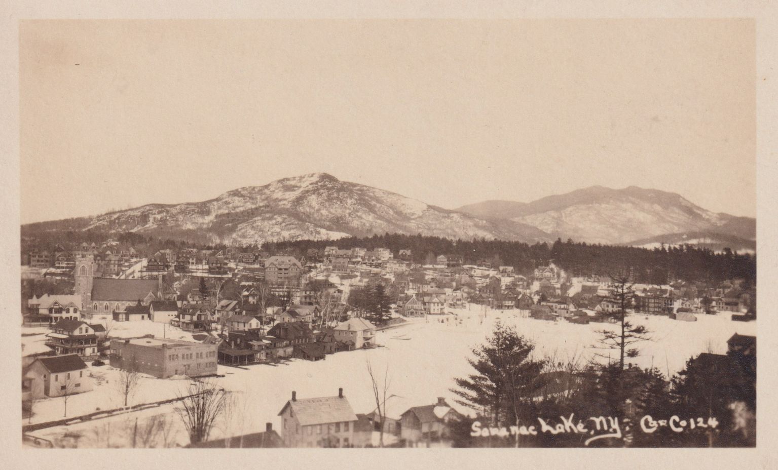 Black-and-White photograph postcard showing a view of Lake Flower and Saranac Lake looking east from Blood Hill/Lake Street Hill. The second St. Bernard's Church, Santanoni Apartments, and Alta Vista Lodge buildings are visible. Printed caption on front reads, "Saranac Lake, NY." Printed by Car. Co. Photo Shop (C. C.). Unused, divided back, white border.Collection