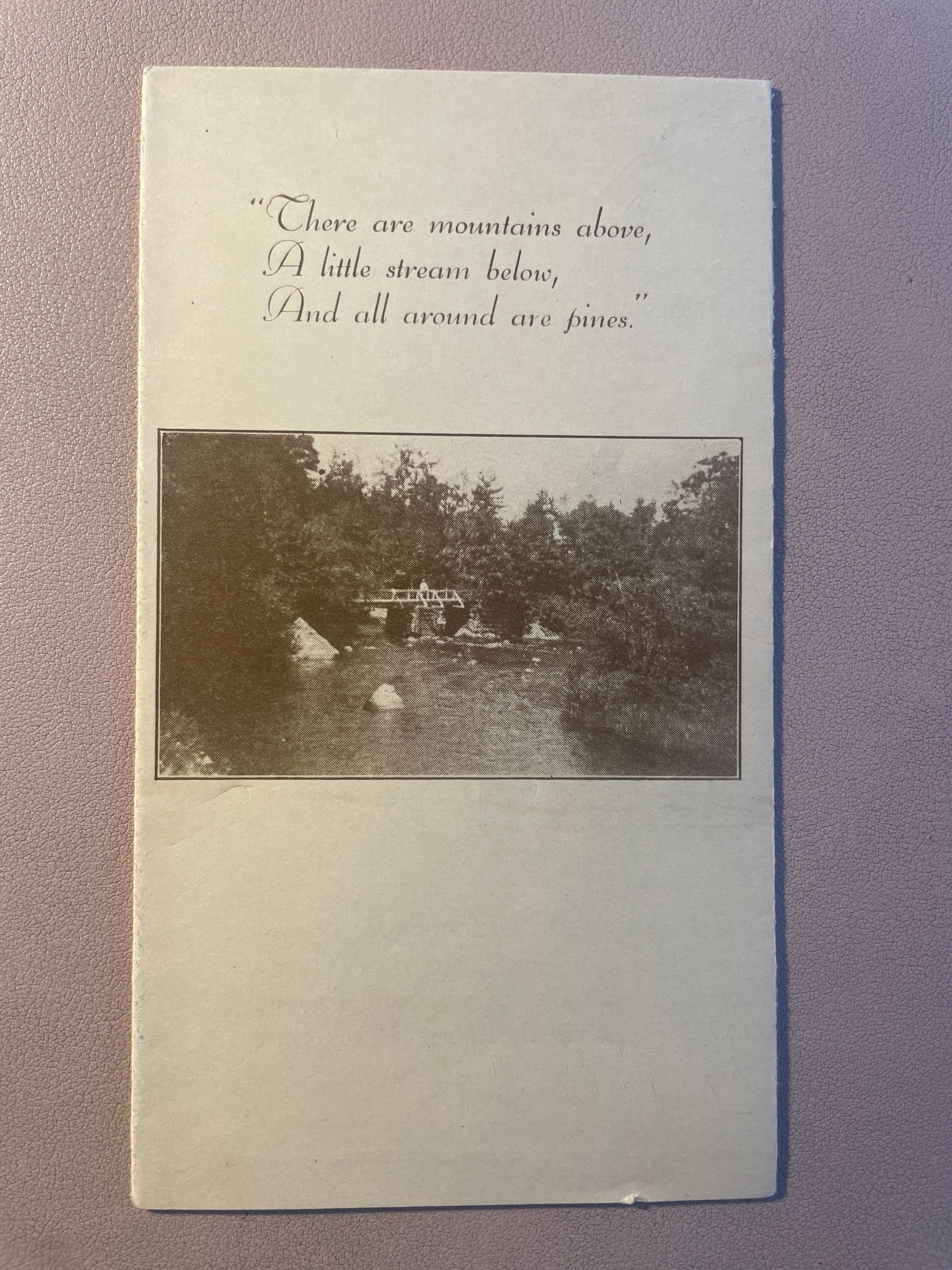 Pamphlet advertising the Bartlett Carry Club, c. 1927 or later. Front cover has photograph of bridge, with "There are mountains above, a little stream bellow, and all around are pines," printed above it. Pamphlet unfolds completely and includes photographs, information on amenities, and a map.Lexicon