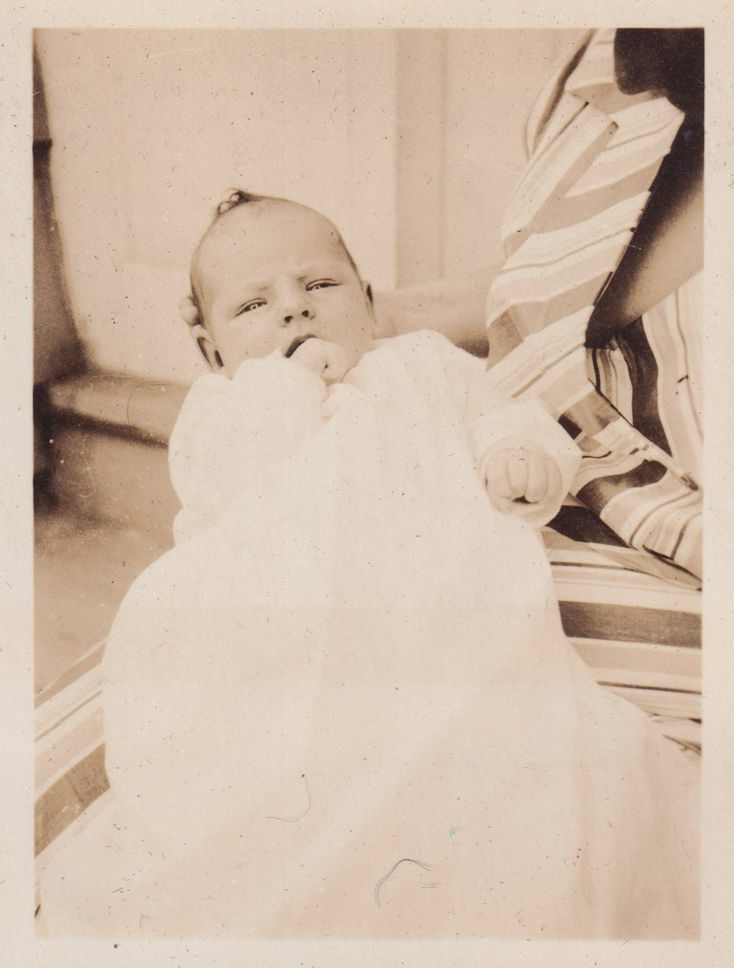 Black-and-White photograph of a newborn Lucy Elizabeth Jones, the daughter of Amy and Blair Jones. She was born July 10, 1931. Part of album 2024.21.1, kept by Amy Jones and David Blair Jones c. 1930-1934.