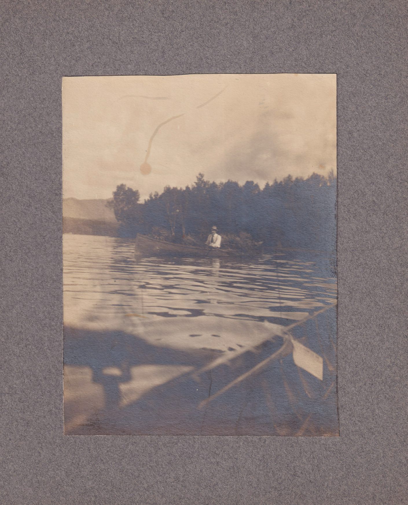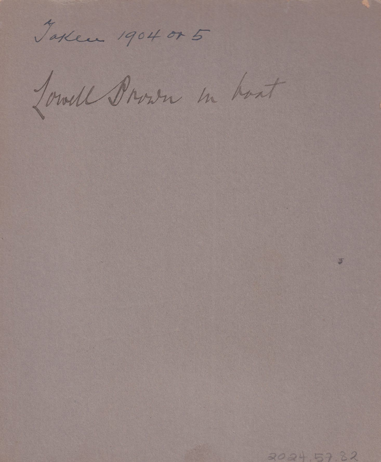 Black-and-White photograph of a man in a guideboat at Bartlett's Carry. The photograph was taken by someone in a guideboat; the edge of the boat and oar are visible. Handwritten note on reverse reads, "Taken 1904 or 5." Note in different handwriting reads, "Lowell Brown in boat." Mounted on gray cardboard backing.