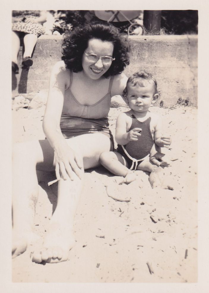 Black-and-White photograph of an unidentified woman and child on a sandy beach. Both are wearing swimsuits. The photograph was likely printed by Kollecker's Kodak and Gift Shop.