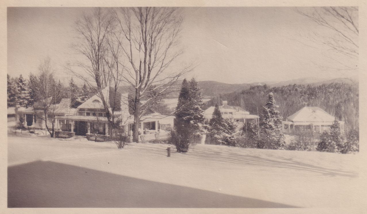 Black and white photograph of cottages at Trudeau Sanatorium in the winter. There is snow covering the ground and most of the cottages' roofs.
