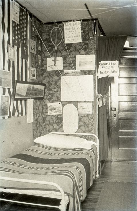 Negative of one side of a dorm room. There is a bed and various things posted to the wall: an American flag, a framed photograph, a tennis racket, and other images. Most likely taken by Mary Ives Baldwin. This item is not fully cataloged but has been uploaded so the image is publicly available; if you would like us to prioritize cataloging this item, please contact the HSL Collections team.