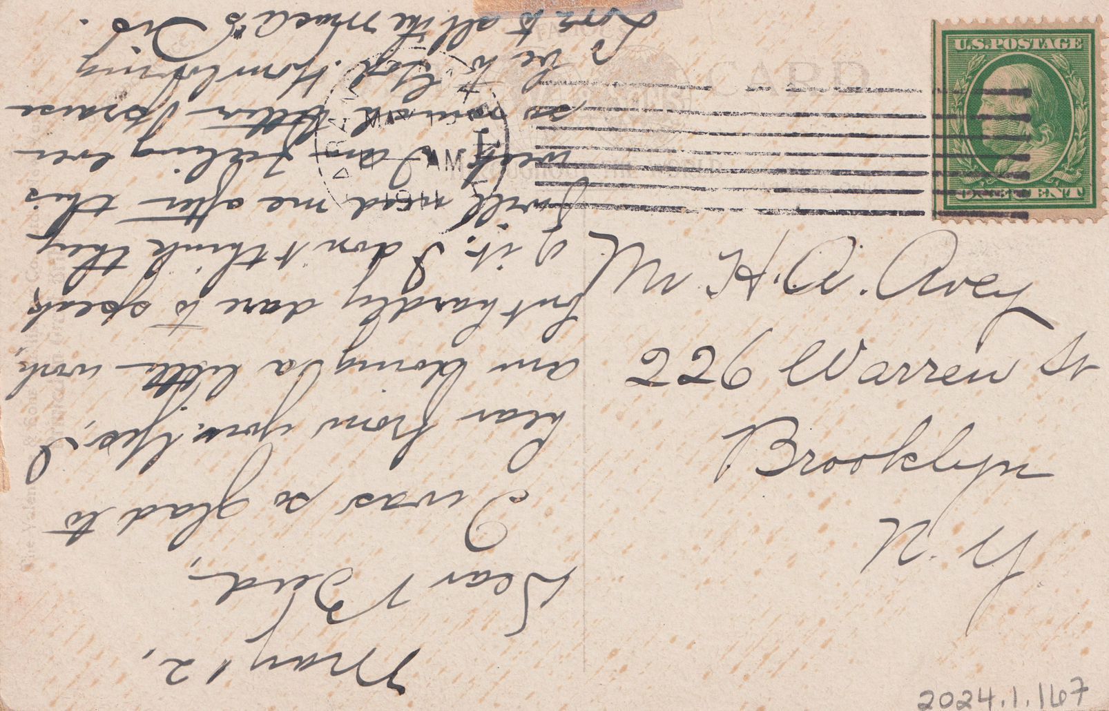 Color postcard showing the view looking West down Main Street. The first Saranac Lake High School is visible on the left. Printed caption on front reads, "Main Street, Saranac Lake, N. Y." Printed by the Valentine & Sons' Publishing Co., Ltd., New York. Used, divided back, postmarked Saranac Lake, May 13, 1911. Handwritten message on reverse reads, "May 12, Dear Bud, I was so glad to hear from you. I am doing a little work, but hardly dare to speak of it. I don't think they will need me after this week. I am feeling ever so much better, praise be to God. Your loving Sis. Love to all the MacA's." Mailed to Mr. H. A. Avery, 226 Warren St., Broolyn, NY.Subject Place