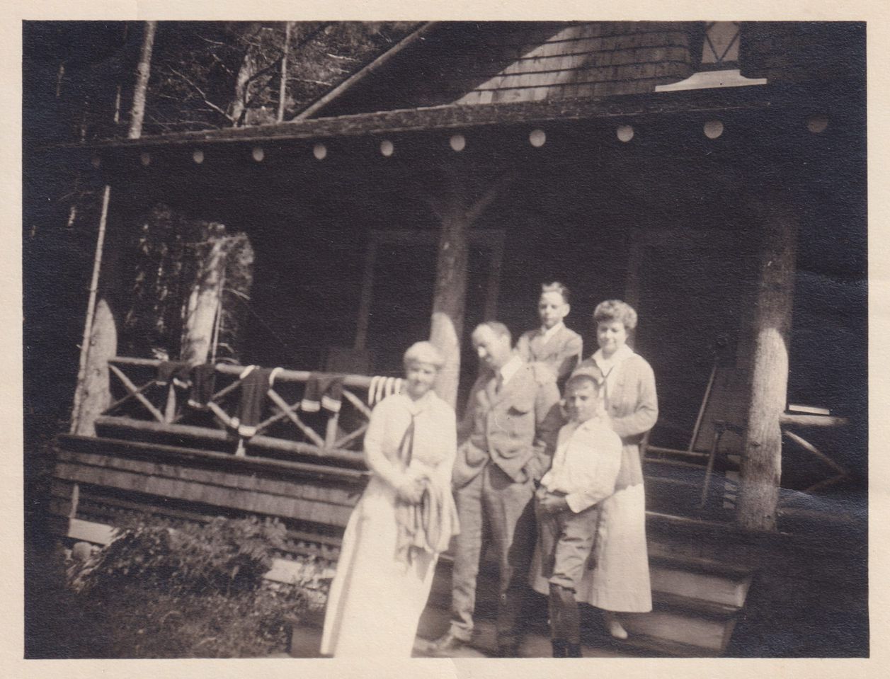 Black-and-White photograph of a group of unidentified people standing in front of a cottage at Bartlett Carry Club.