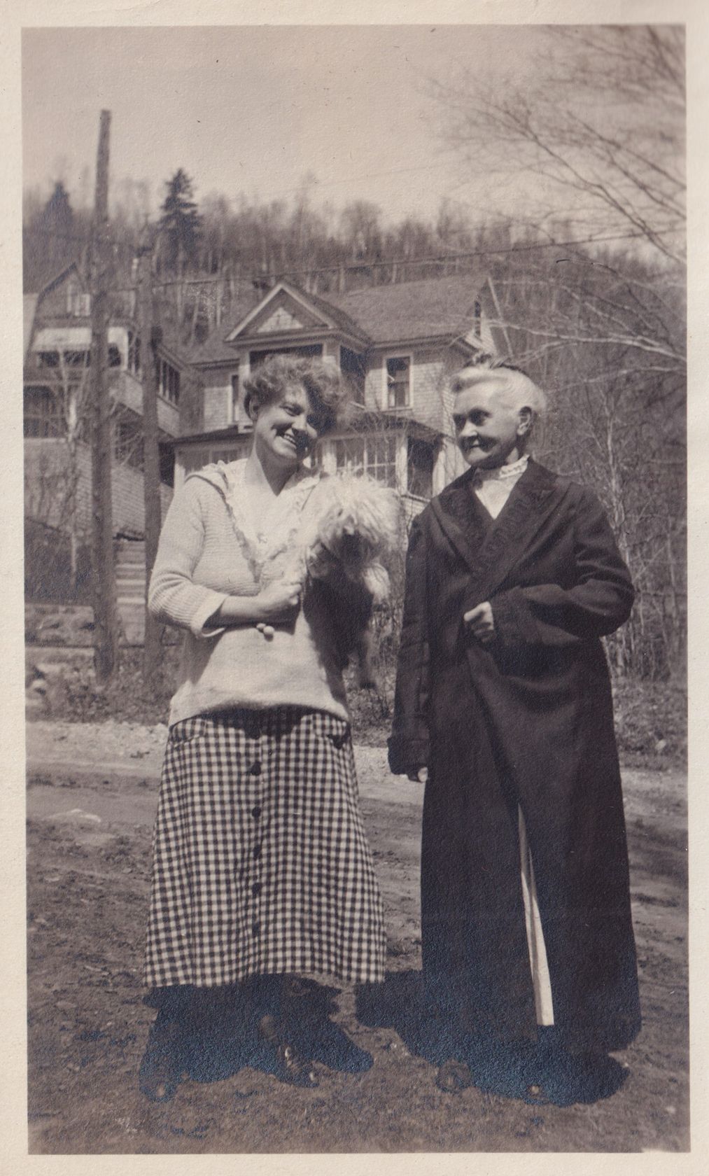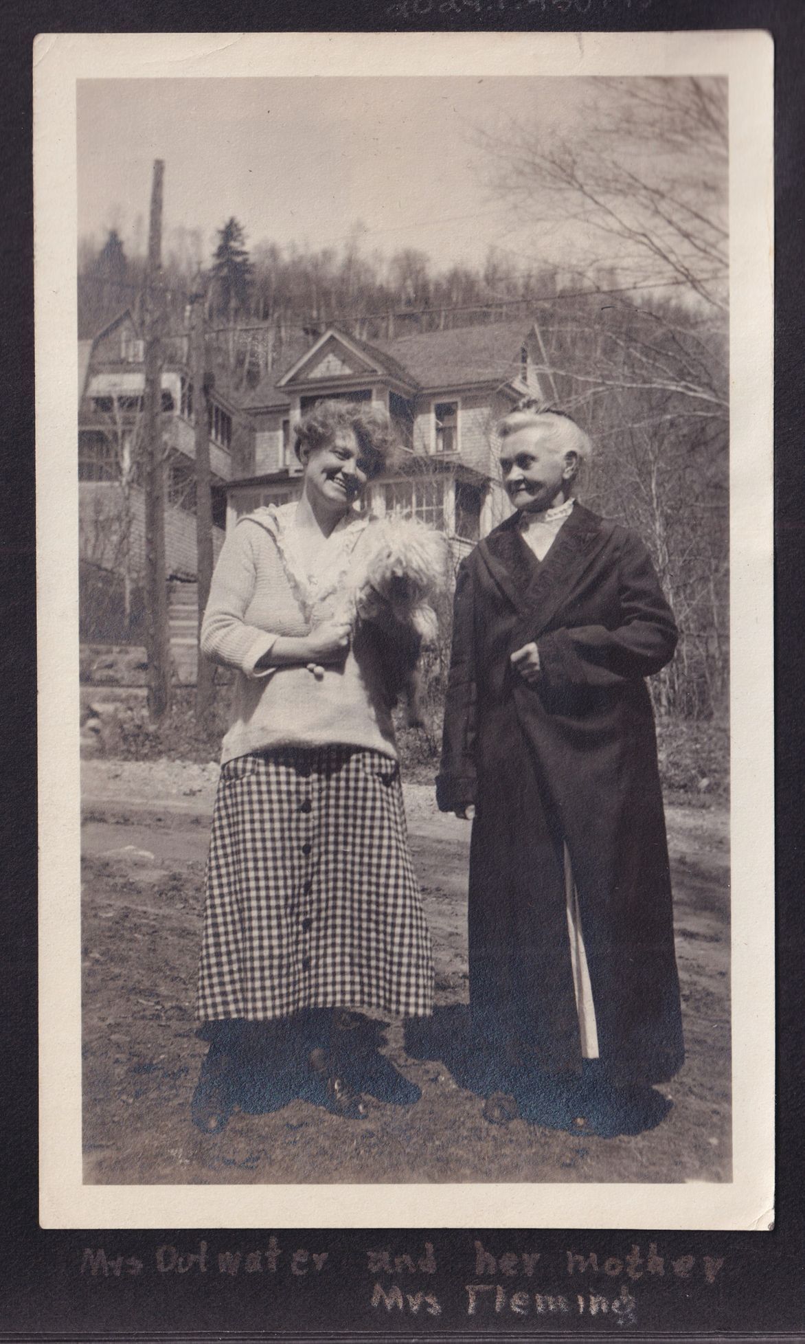Black and white photograph of two women standing outside together outside. The woman on the left is holding a small dog. Two cure cottages can be seen behind them. Beneath the photo is the caption, "Mrs Outwater and her mother Mrs Fleming."