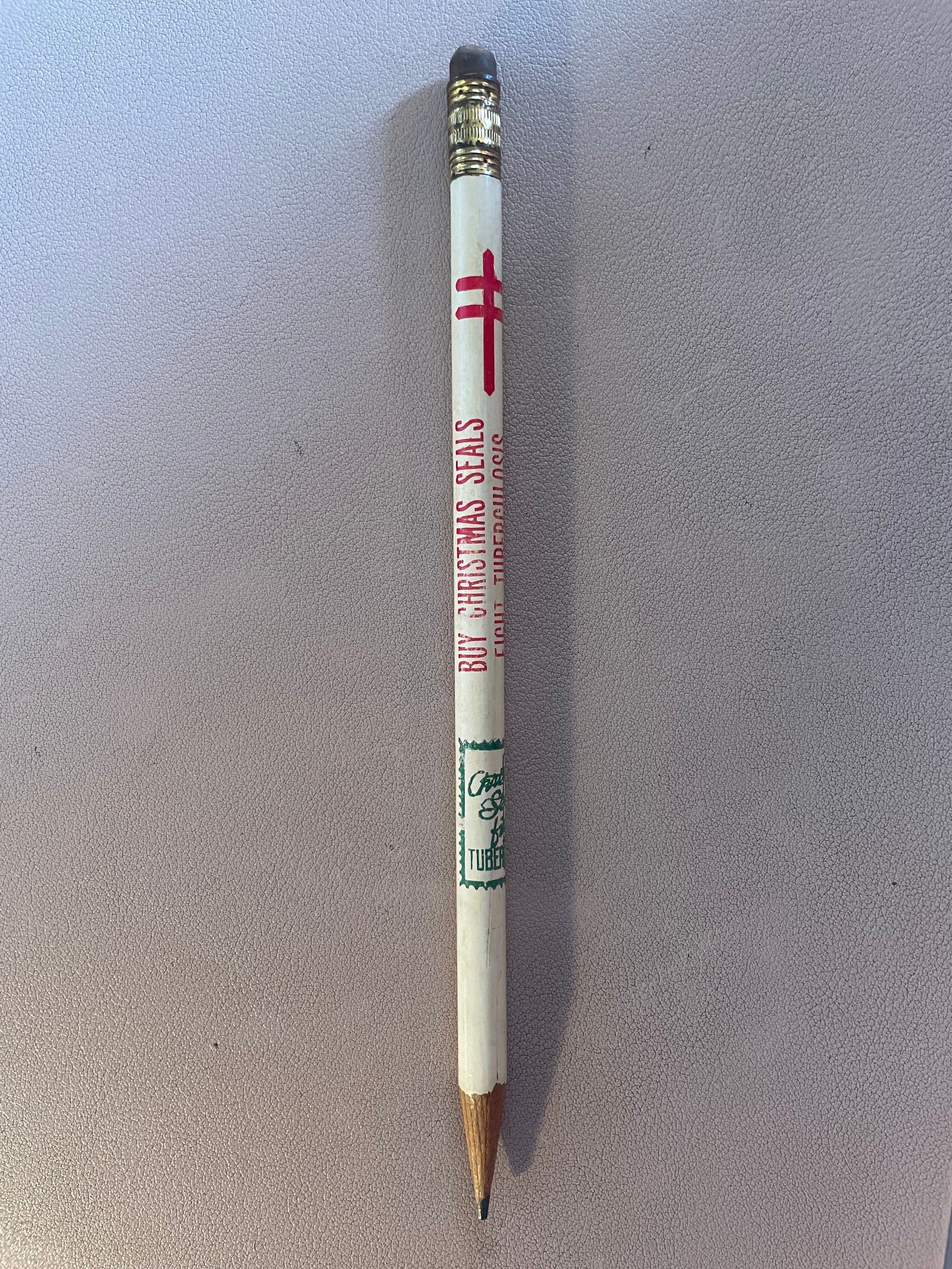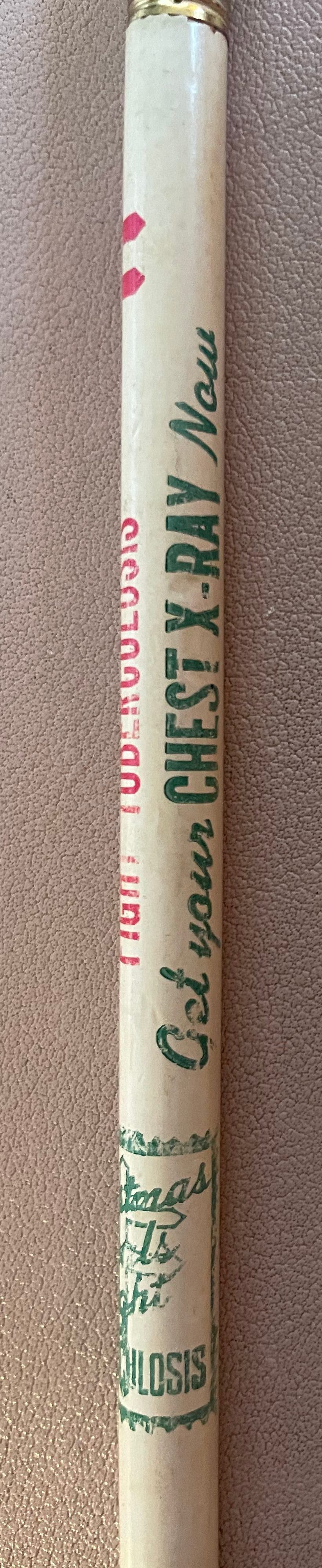 Pencil with Christmas Seals promotional message. Pencil body is white, and "Buy Christmas Seals, Fight Tuberculosis. Get your Chest X-Ray Now," is printed in red and green along with a double-barred cross and Christmas Seal emblem.Collection