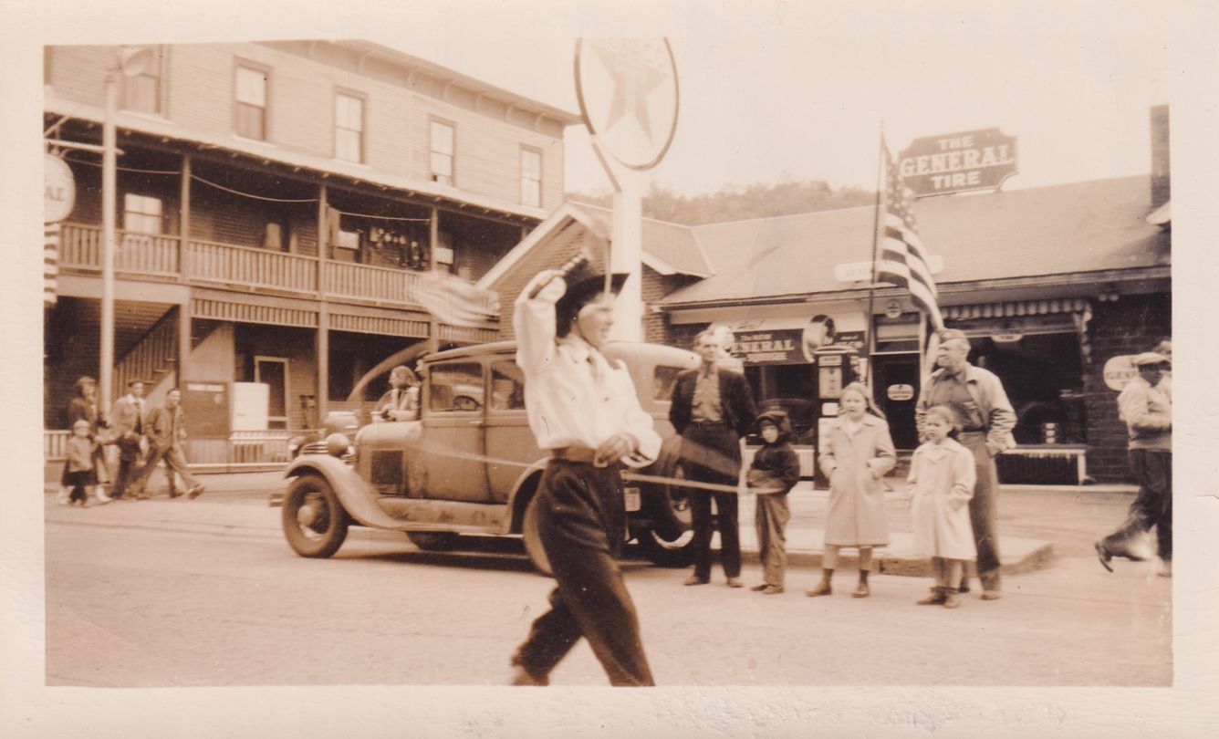 Black and white photograph of a person in jeans and a cowboy hat twirling a lasso above their head. There are people watching from the side of the road, suggesting the person is part of a parade. The General Tire can be seen in the background of the photo.