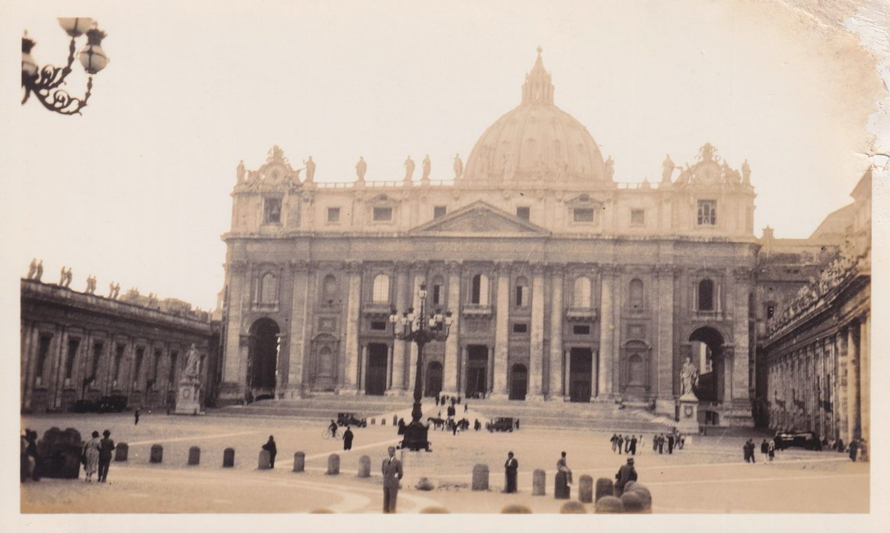 Black-and-White photograph of the Vatican. The dome of St. Peter's Basilica can be seen in the background. The photograph was likely taken by a person on vacation in Italy and printed by Kollecker's Kodak and Gift Shop.