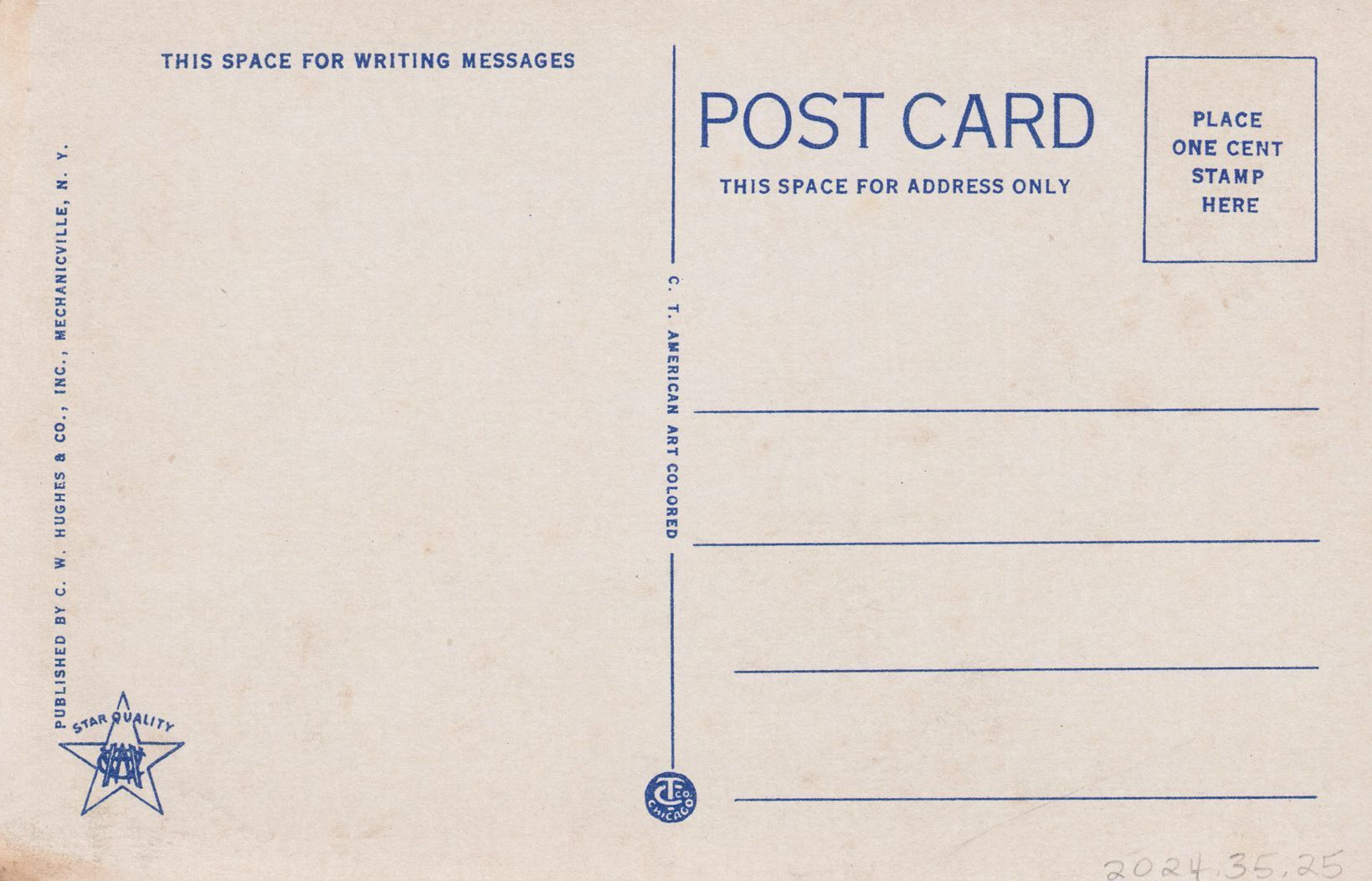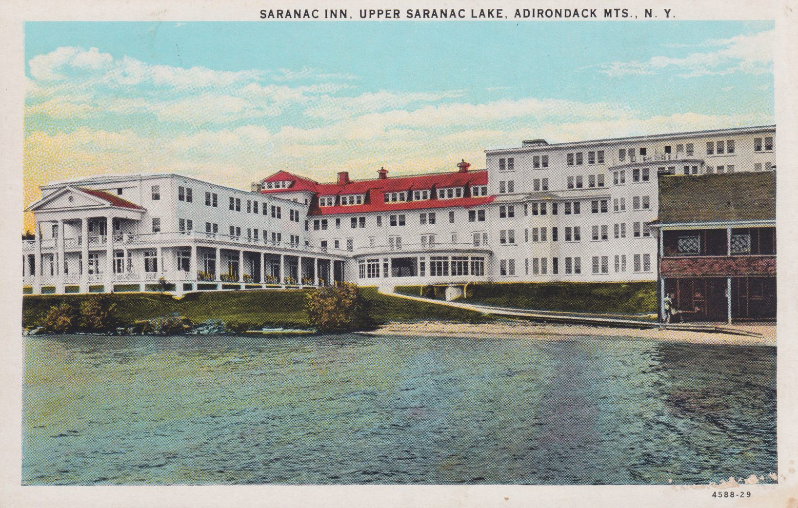 Color postcard showing Saranac Inn from Upper Saranac Lake. Printed caption on front reads, "Saranac Inn, Upper Saranac Lake, Adirondack Mts., N. Y." Printed by C. W. Hughes & Co., Inc., Mechanicville, NY. Unused, divided back, white border.Subject Place