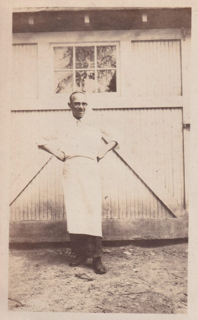 Black-and-White photograph of an unidentified man in an apron, likely a kitchen worker from the Clara Black Cottage. He is standing in front of a garage door.