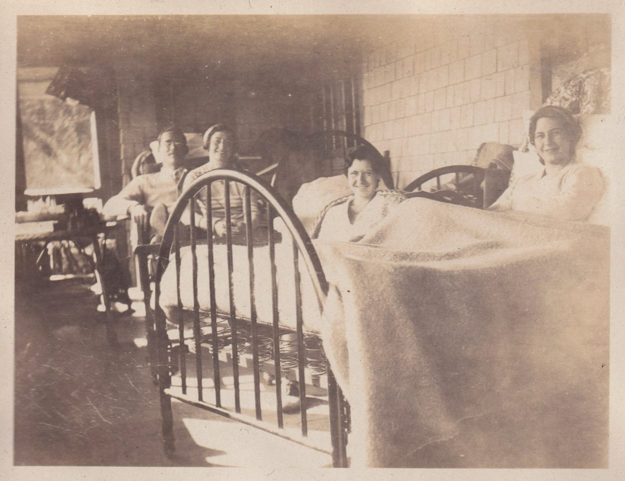 Black-and-White photograph of D. Blair and Amy Jones seated on a cure porch with two unidentified women. One of the women is reclining in bed.