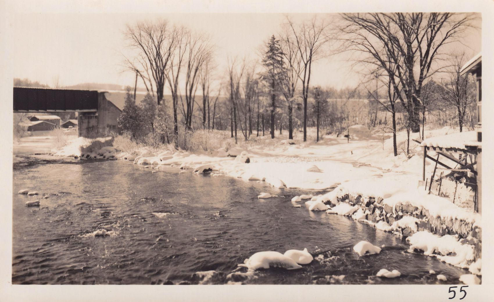 Black-and-White photograph of an unidentified snowy river passing under a bridge. "55" is handwritten on the bottom right corner. The photograph was likely printed by Kollecker's Kodak and Gift Shop.