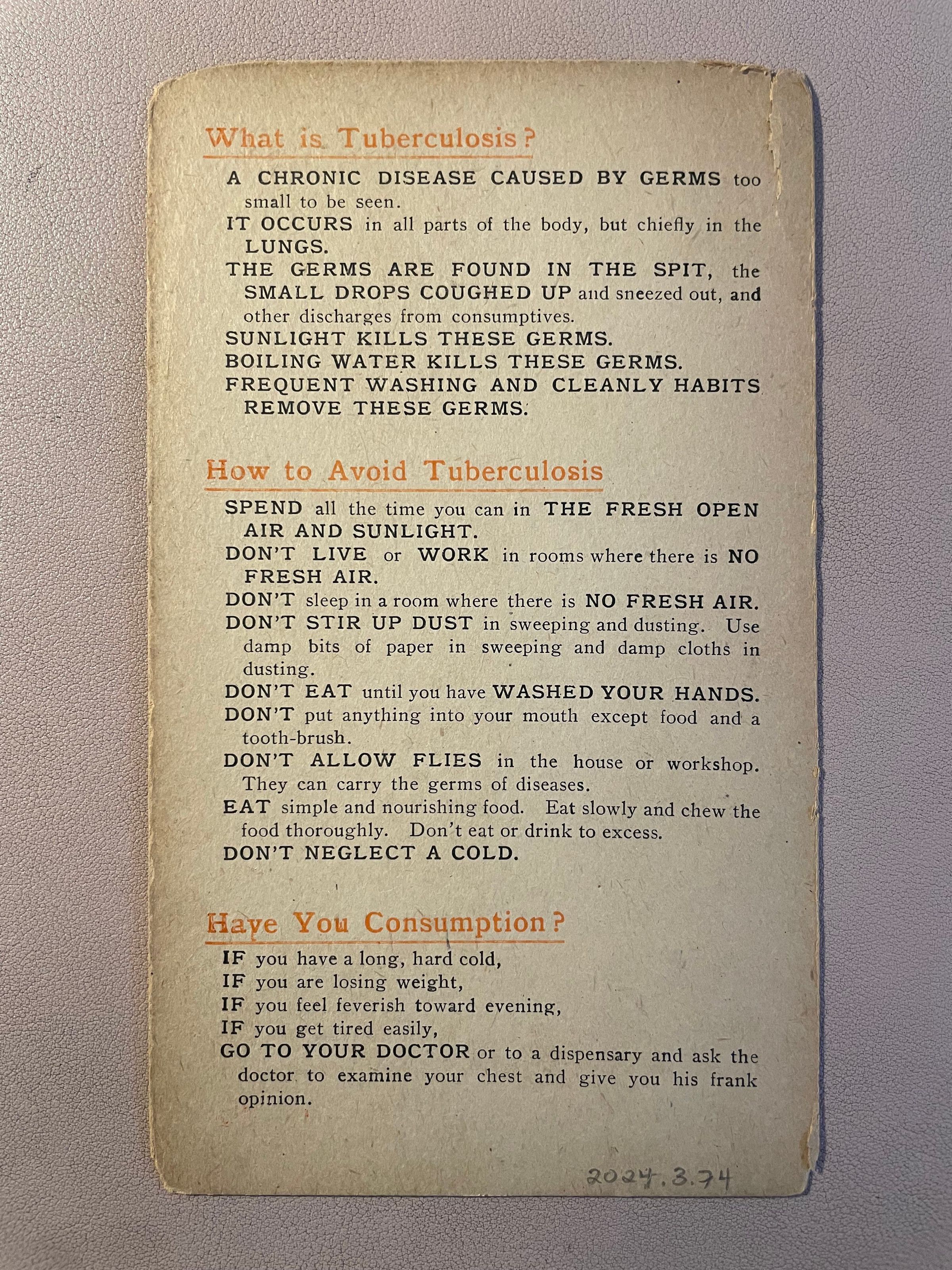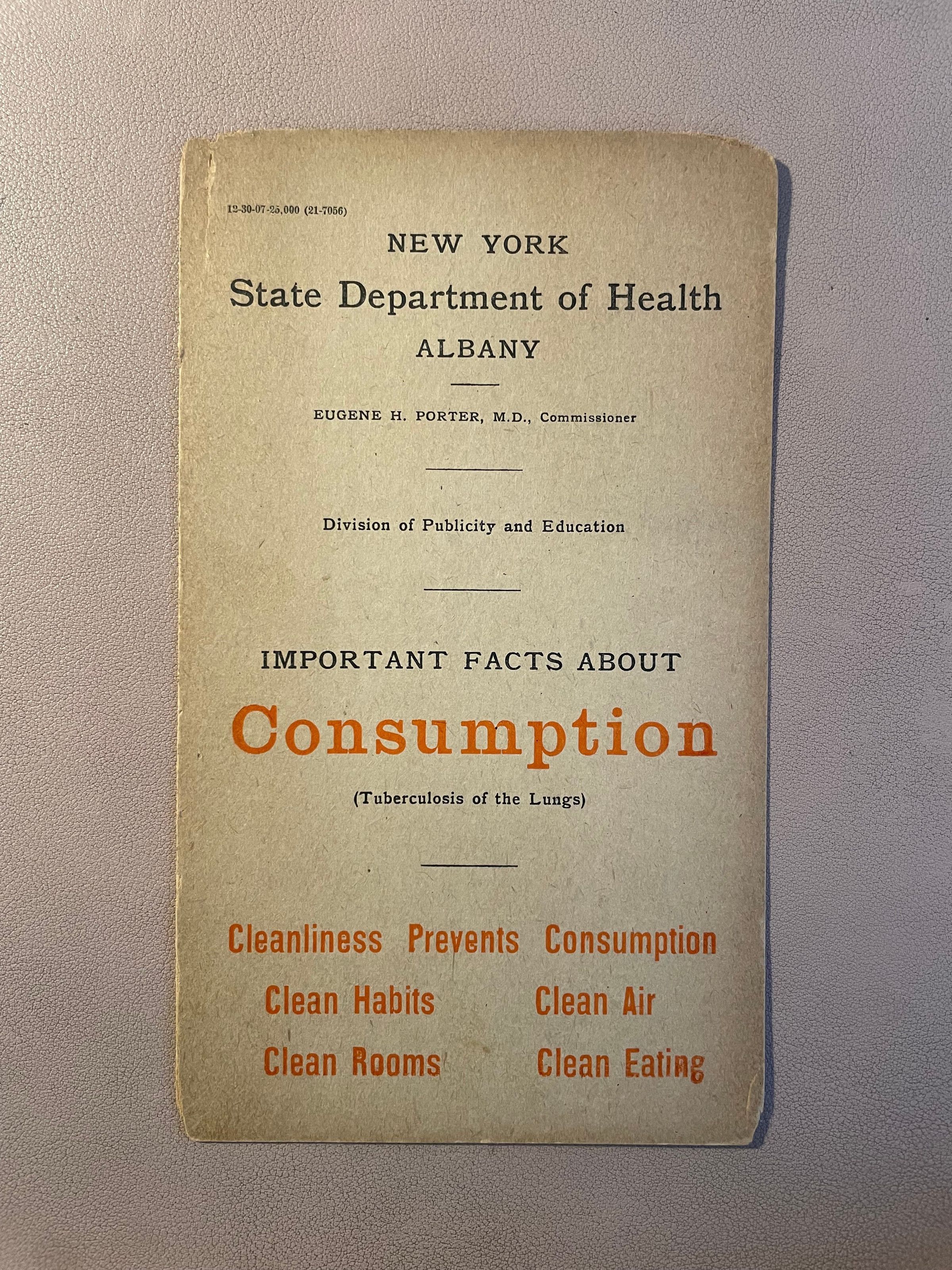 Handbill produced by the New York State Department of Health, "Important Facts About Consumption." Includes information on tuberculosis, preventative tips, and symptoms.