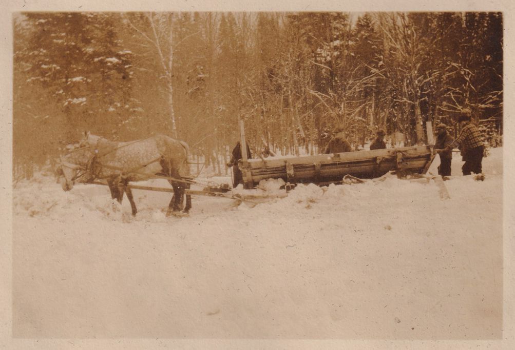 Black-and-White photograph of a horse-drawn ice sled on Ampersand Bay. Workers can be seen behind the sled. Part of album 2024.21.1, kept by Amy Jones and David Blair Jones c. 1930-1934.