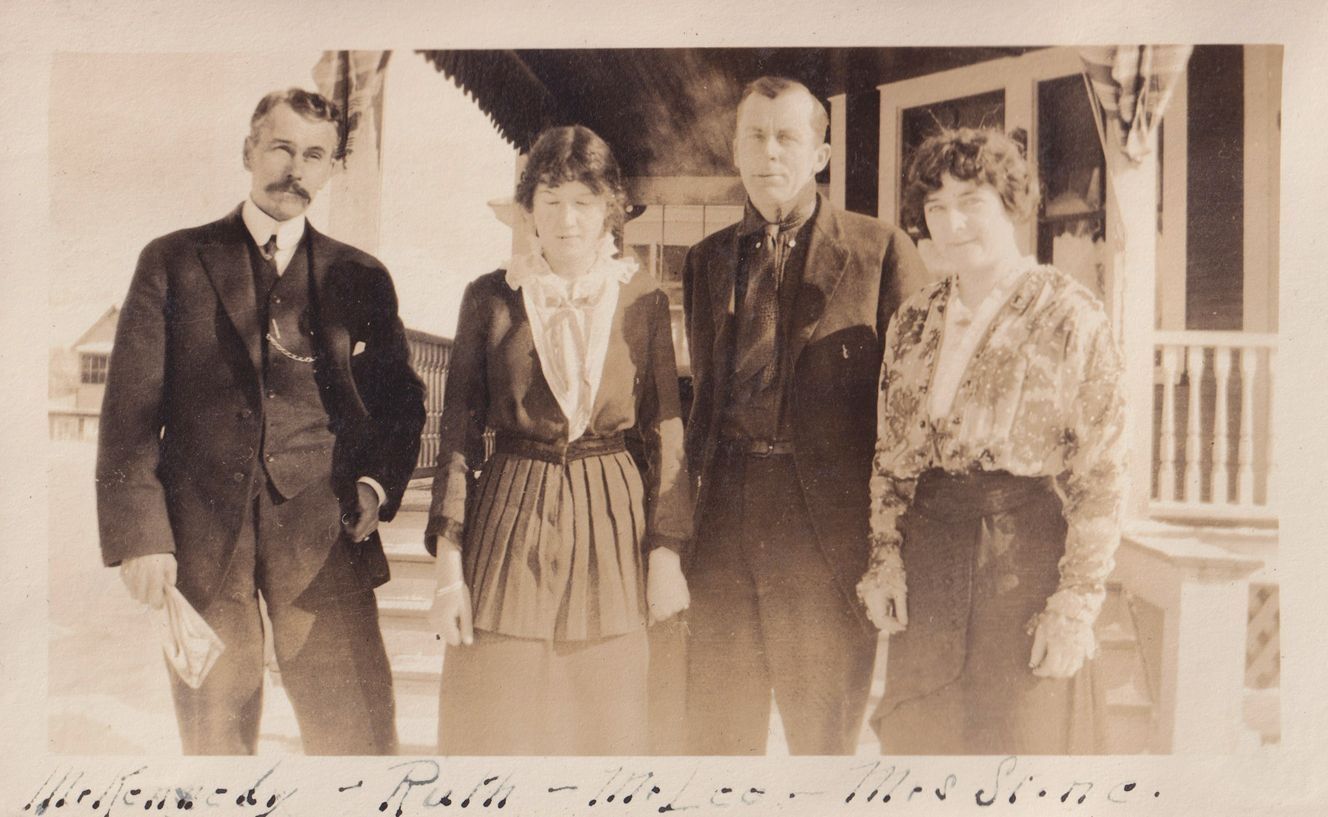 Black-and-white photograph of two women and two men standing together at the front steps of a cure cottage, likely the cottage owned by Mr. Kennedy. "Mr Kennedy - Ruth - Mr Lee - Mrs Stine[?]" is written in ink at the bottom of the photograph.