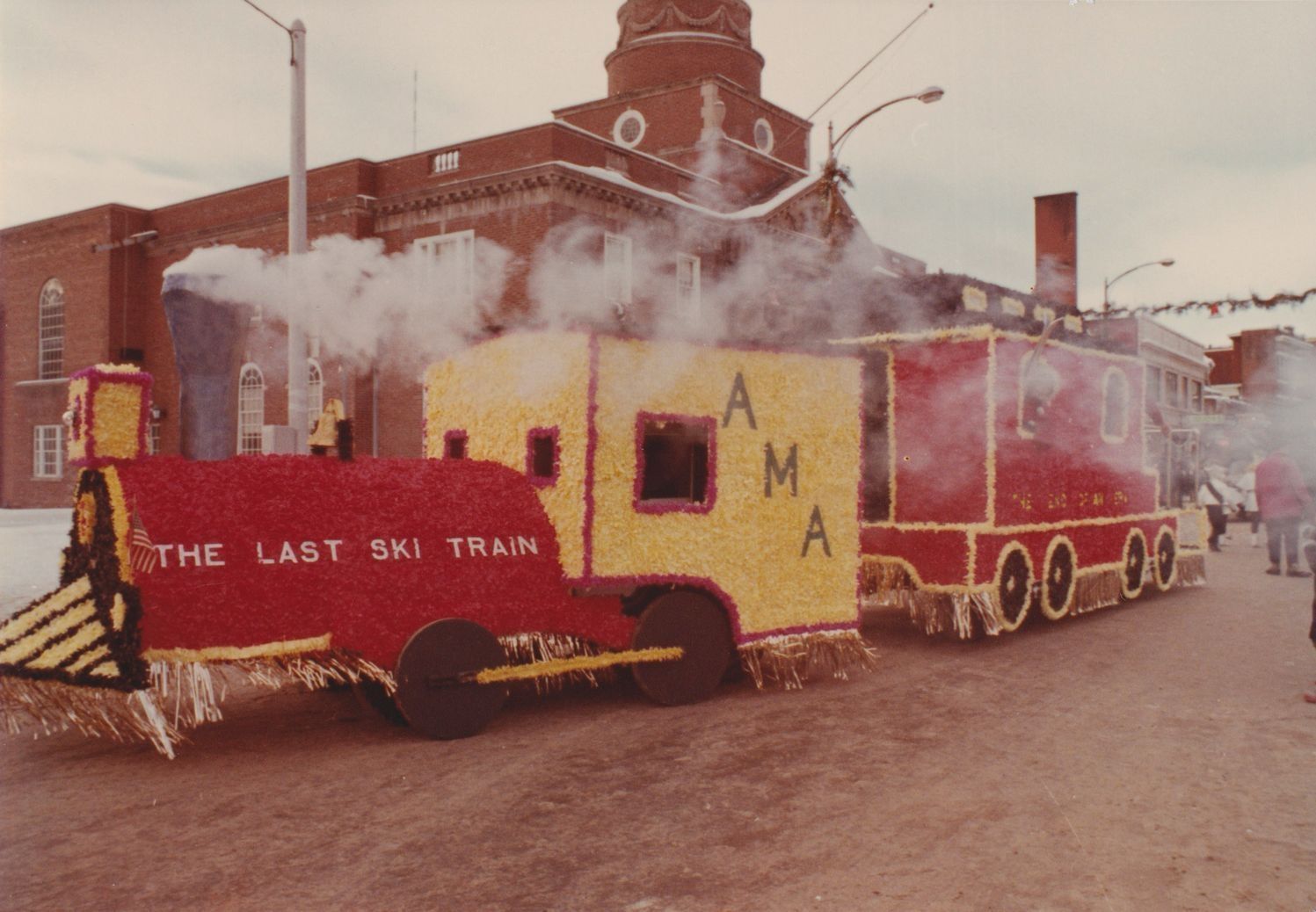 Color photograph of a Winter Carnival float shaped like a steam engine with one train car behind it. The train is red and yellow and says "The Last Ski Train" and "AMA" along its side. Harrietstown Town Hall can be seen behind the float. This photograph is from an album of photographs taken by staff of the American Management Association.