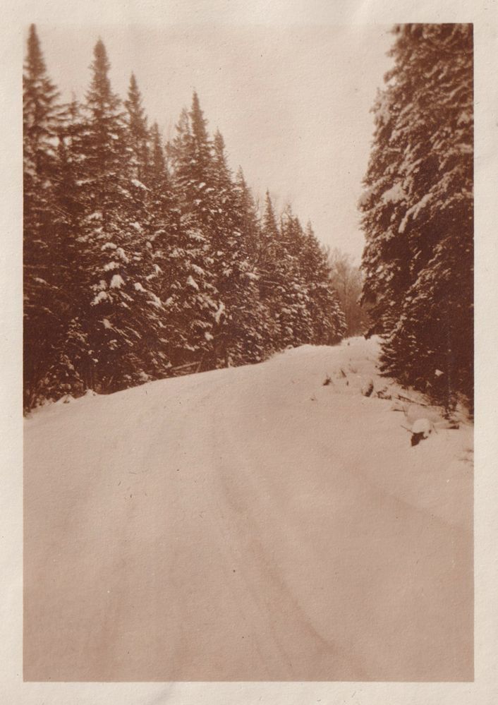 Black-and-white photograph of a snow-covered road through a wooded area. There are tire and ski tracks through the snow.