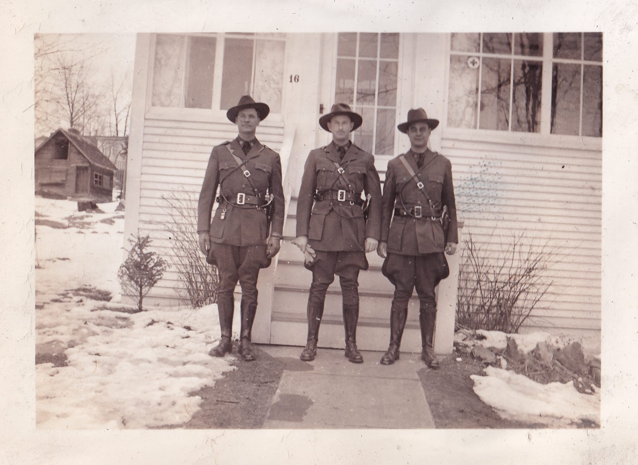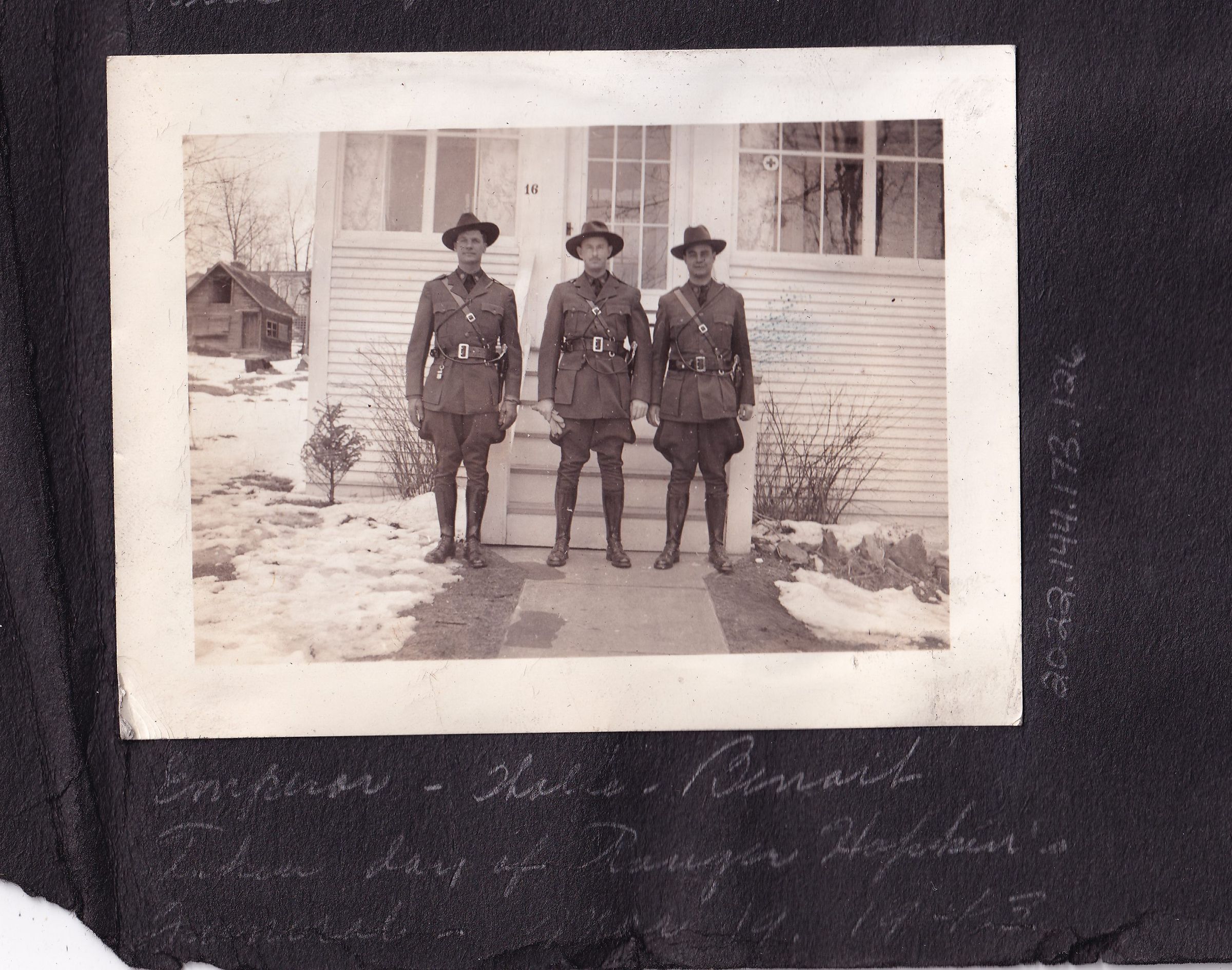 Black-and-White photograph of three men in game warden uniforms standing in front of Emperor's house at 16 Jenkins Street. Handwritten caption on page reads, "Emperor, Halse [?], Benoit. Taken day of Ranger Hopkins' funeral. Mar. 19, 1943."Photograph Details