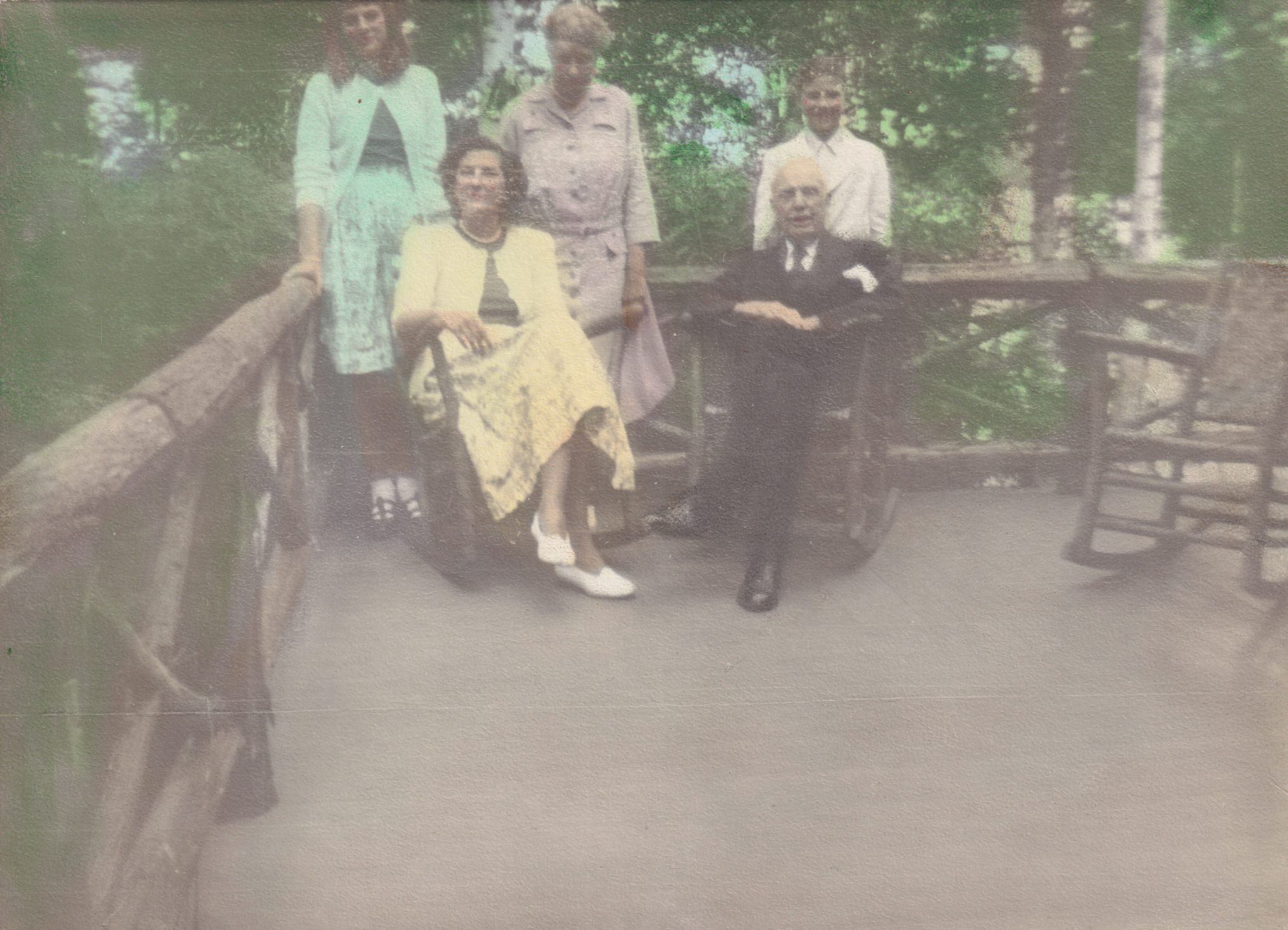 Hand-colored photograph of members of the Yardley Family on a porch at Bartlett Carry Club. From left, standing: Pamela Yardley, unidentified, Jay Yardley. Seated: unidentified, Farnham Yardley. Handwritten note on reverse reads, "Camp Waubenoo, August 1948."Photograph Details