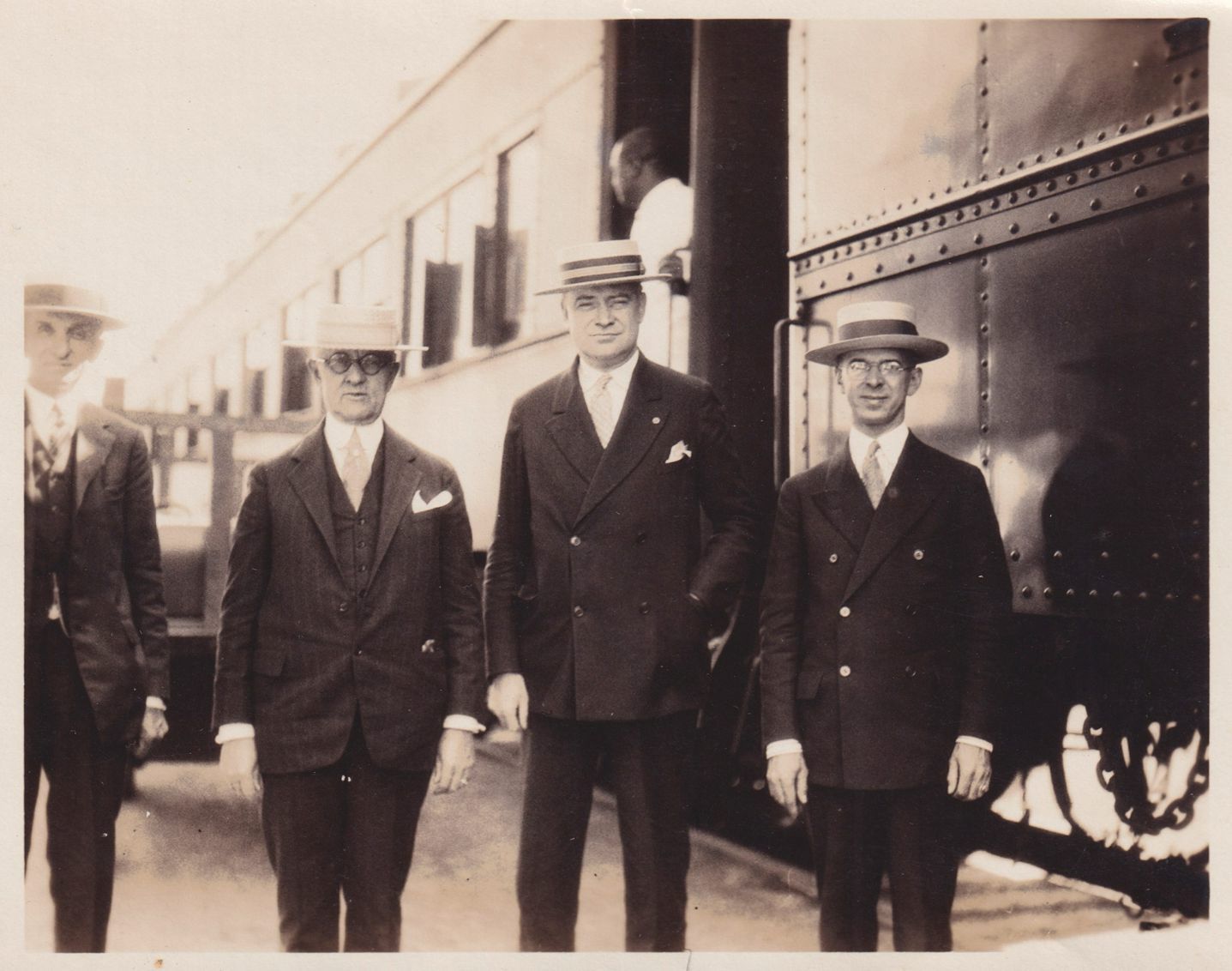 Black-and-White photograph of four unidentified men in suits and hats standing next to a train. The photograph was likely printed by Kollecker's Kodak and Gift Shop.