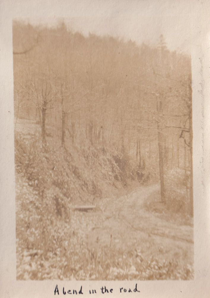 Black-and-white photograph of a dirt road curving through a wooded area with an incline on one side. "A bend in the road" is written in ink beneath the photograph.