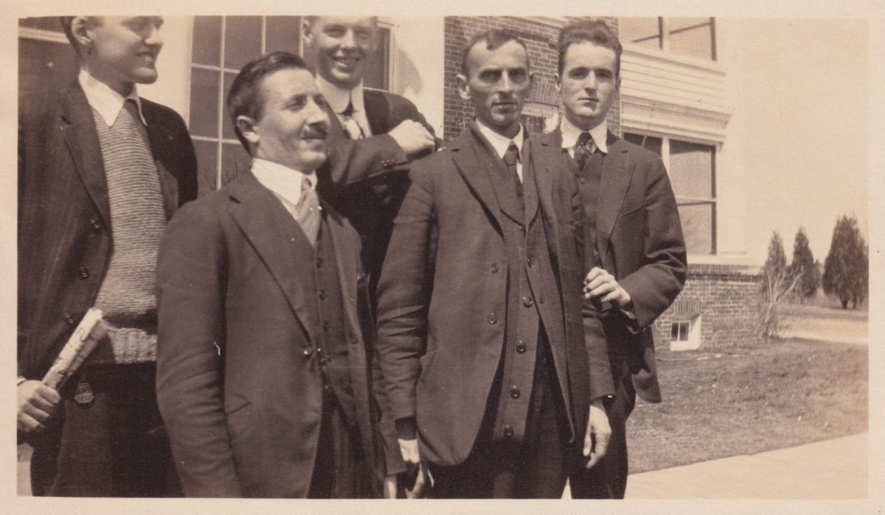 Black-and-White photograph of five unidentified men in suits outside of Reception Hospital/the Prescott House. Cure porches are visible behind them. The photograph was likely printed by Kollecker's Kodak and Gift Shop.