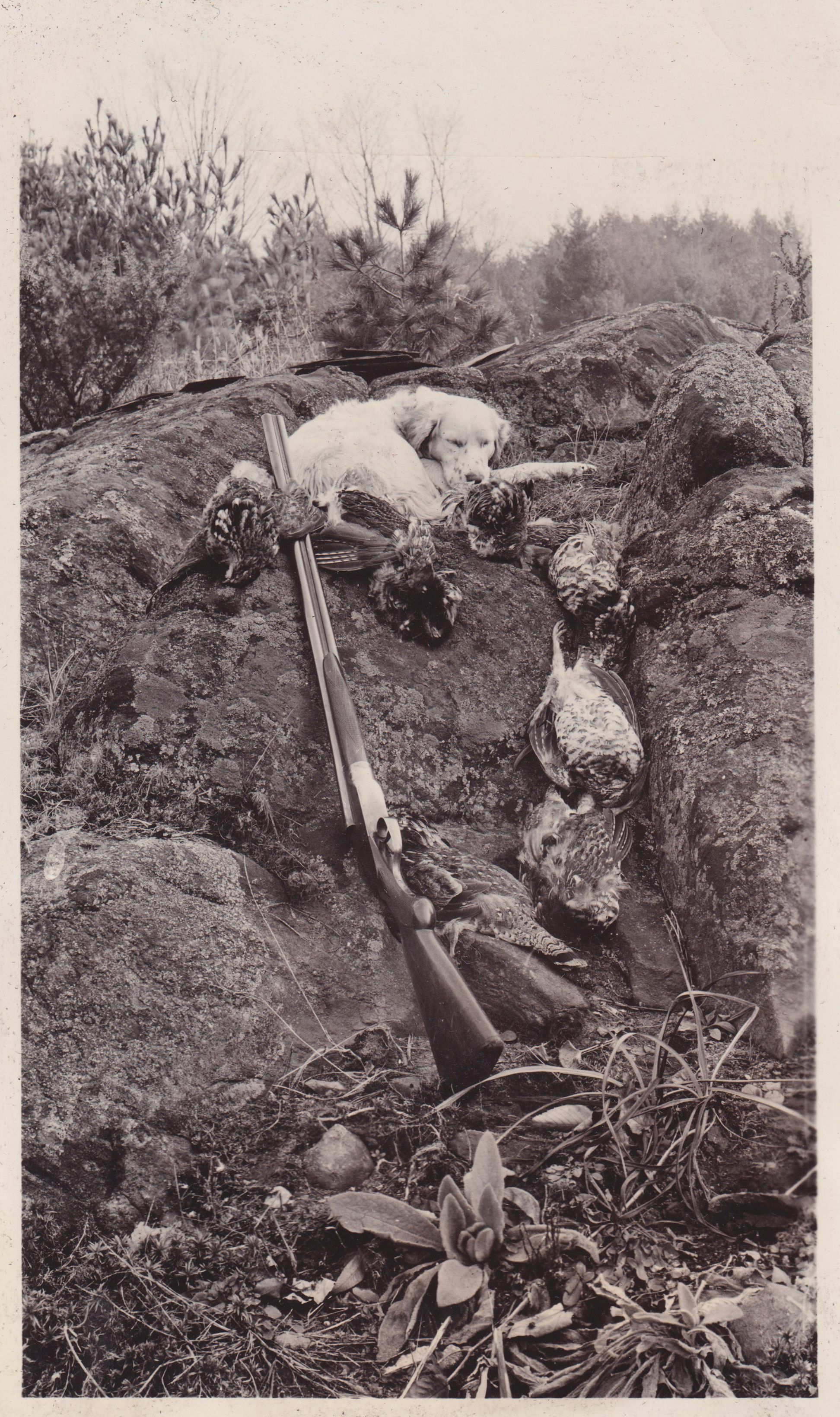 Black-and-White photograph of dead game birds laid out on a boulder. There is a rifle leaning next to them and a hunting dog curled up above. Note: this is the same photograph as 2022.144.173.132.